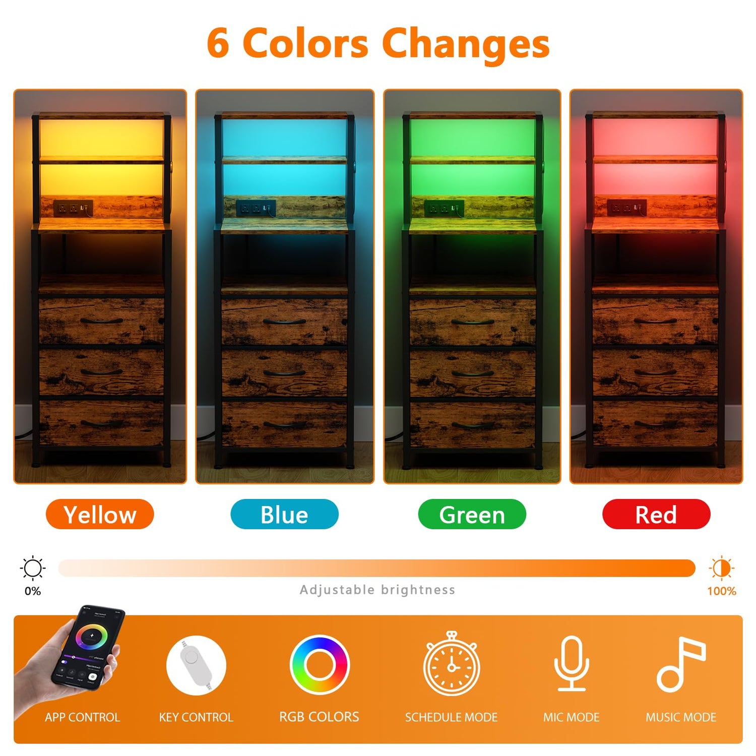 Furnulem Night Stand, Tall Nightstand with 4-Tier Shelves and 3 Fabric Drawers, LED Bed Side Tables with Charging Station, Bedside Table for Bedroom, Hallway, Office, Rustic Brown