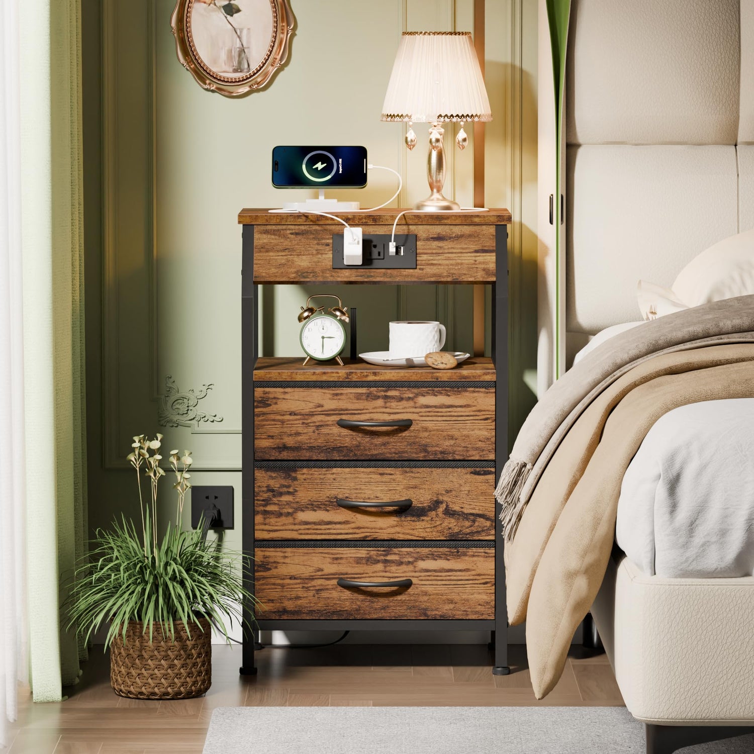 Furnulem Night Stand with Charging Station, USB Ports and Outlets, 28.3 Inch Tall Bedside Table with Wood Shelf, 3 Fabric Drawers Side Table for Bedroom, 3 Ways to Use, Rustic Brown