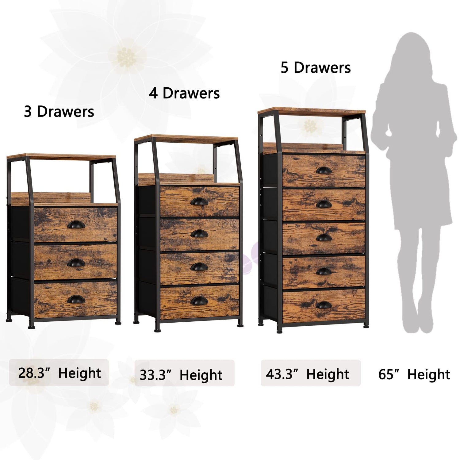 Furnulem Tall 5 Drawers Dresser, Vertical Storage Tower Fabric Dresser for Bedroom, Hallway, Entryway, Nursery, Closet Organizer, Nightstand Bedside Table Furniture, Sturdy Steel Frame, Wood Top