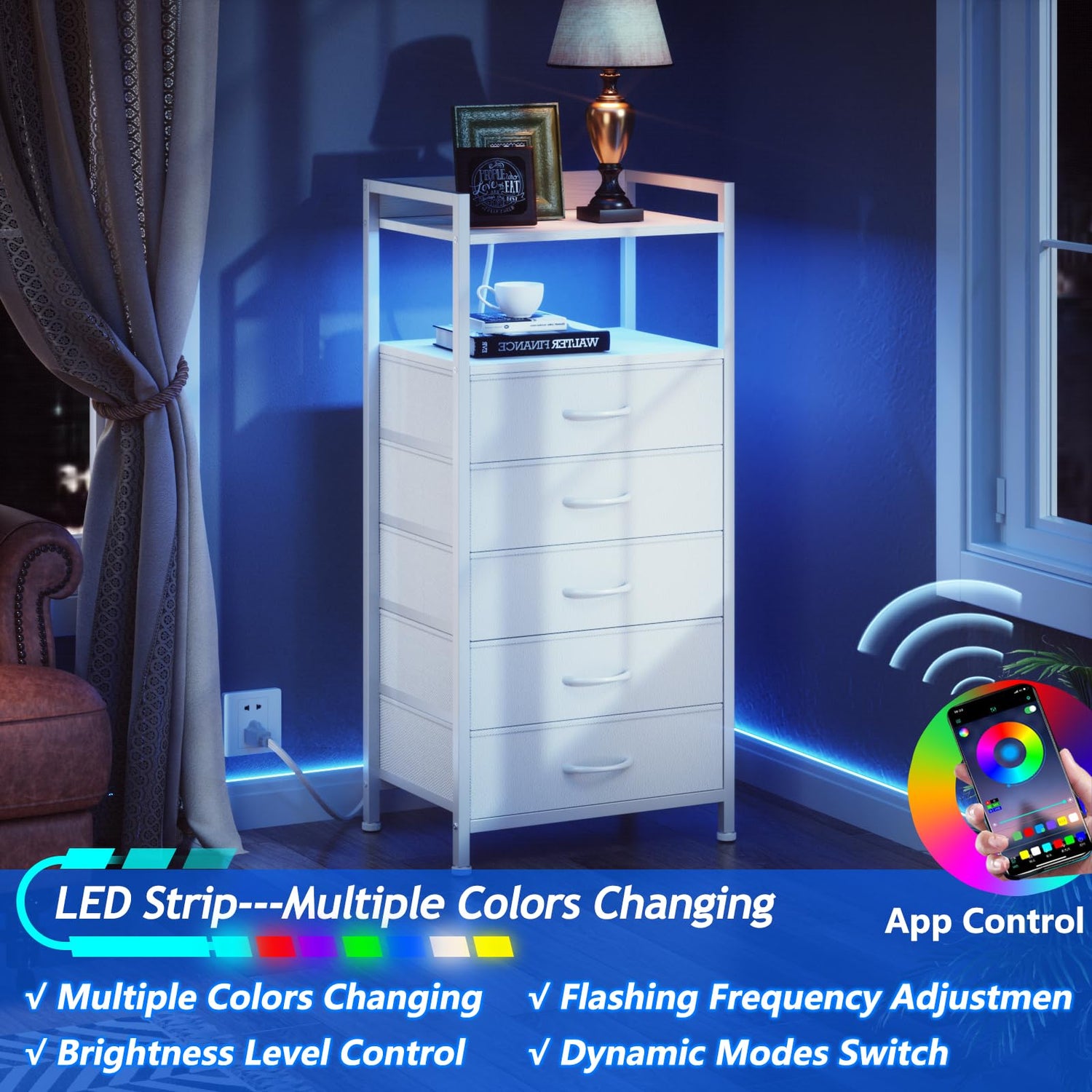 - RGB Led Light Strip: This white dresser is equipped with the RGB lighting strips, there are multiple color, brightness levels, and various flashing modes for you to choose from. Even the LEDs will dance along in sync with the rhythm when you play tunes. You can create the perfect lighting setting to complement your mood and decor.