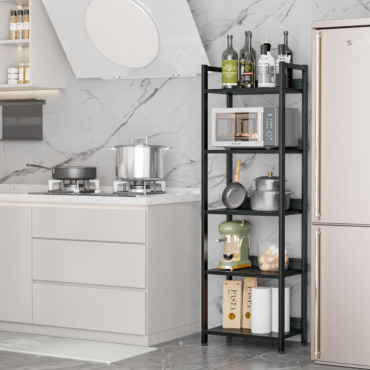 Furologee 5 Tier Bookshelf with Drawer, Kitchen Bakers Rack with Storage, Tall Narrow Bookcase, Industrial Free Standing Display Shelf, Wood and Metal Book Shelf for Bedroom, Living Room, Black