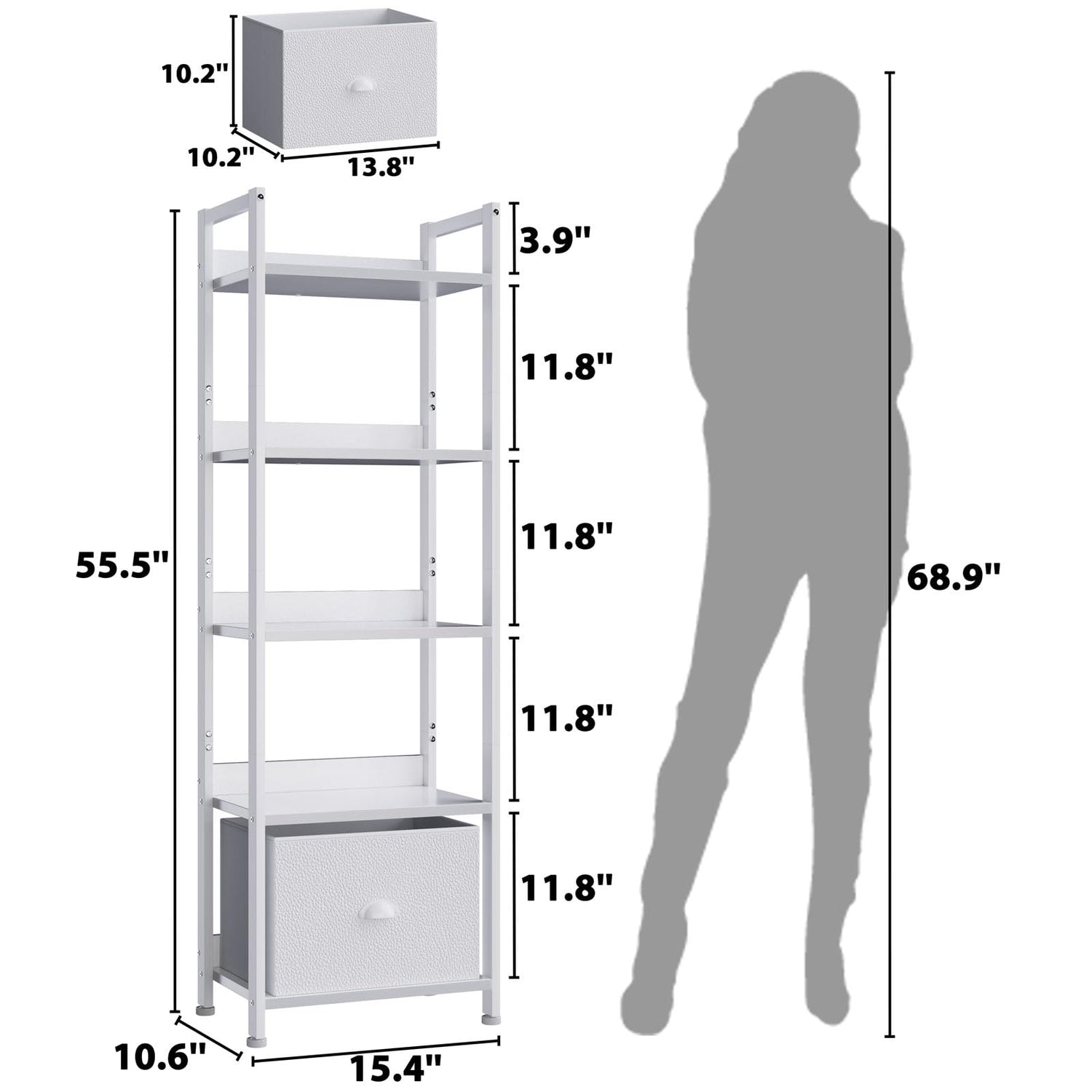 Furologee 5 Tier Bookshelf with Drawer, Tall Narrow Bookcase with Shelves, Wood and Metal Book Shelf Storage Organizer, Modern Display Standing Shelf Unit for Bedroom, Living Room, Office, White