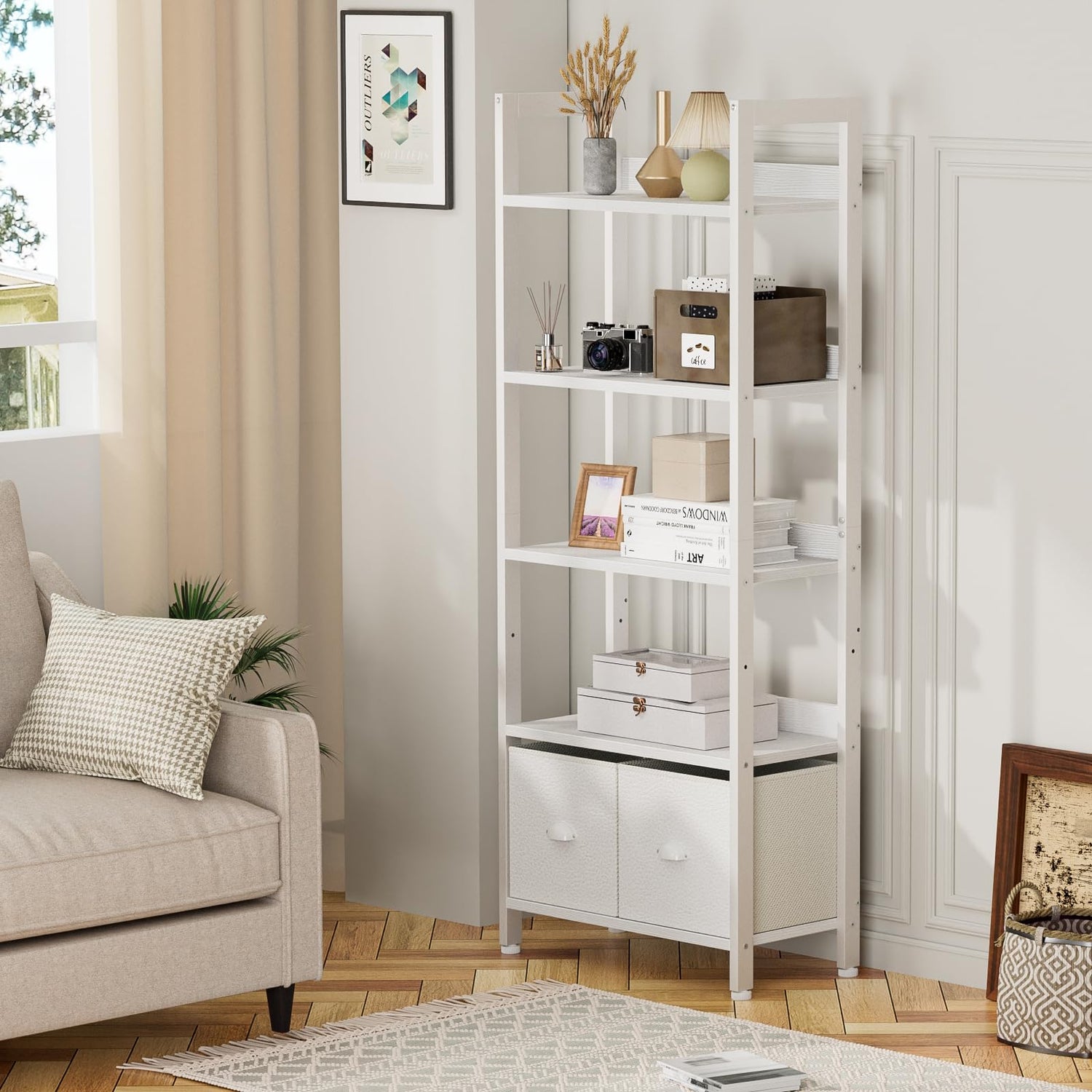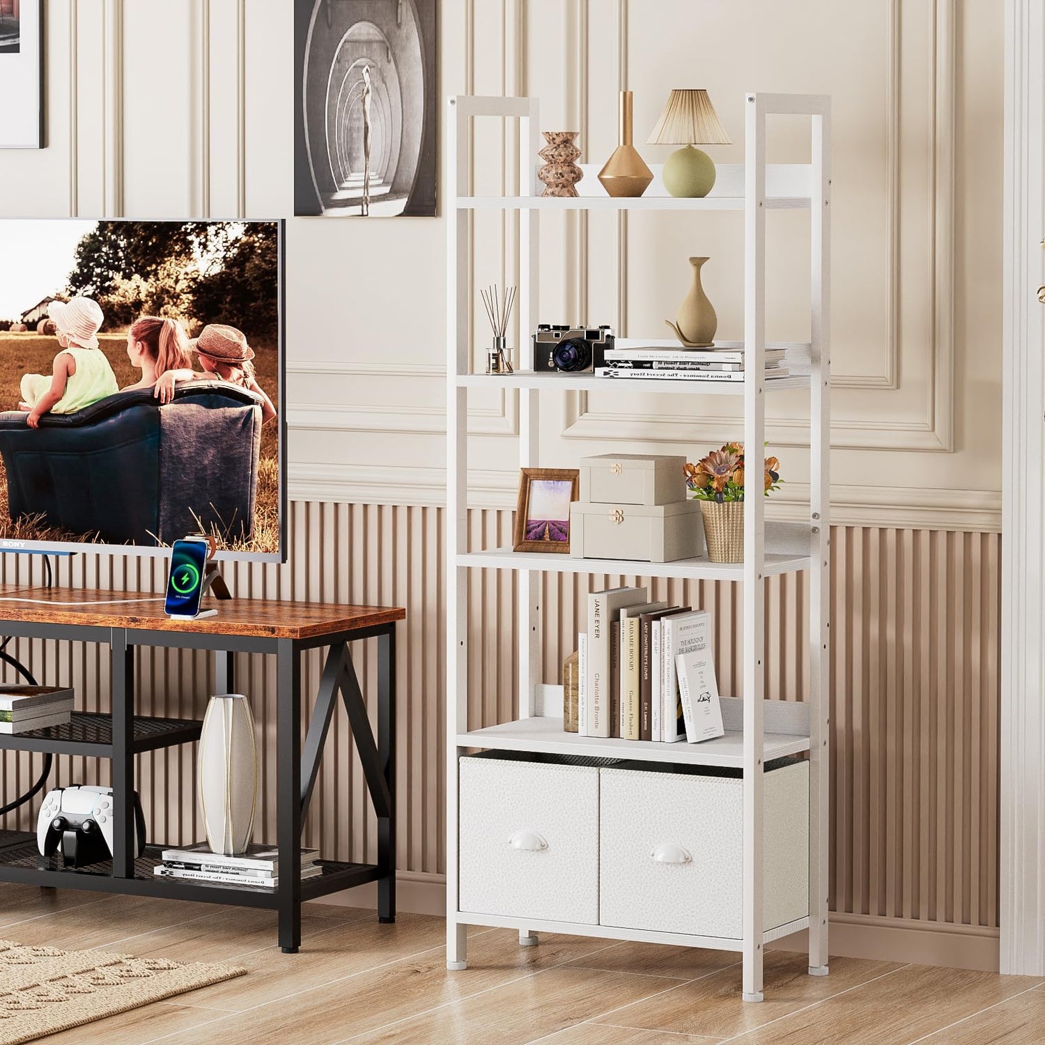 Furologee 5 Tier Bookshelf with Drawers, White Tall Bookcase with Shelves, Wood and Metal Book Shelf Storage Organizer, Modern Display Free Standing Shelf Unit for Bedroom, Living Room, Office