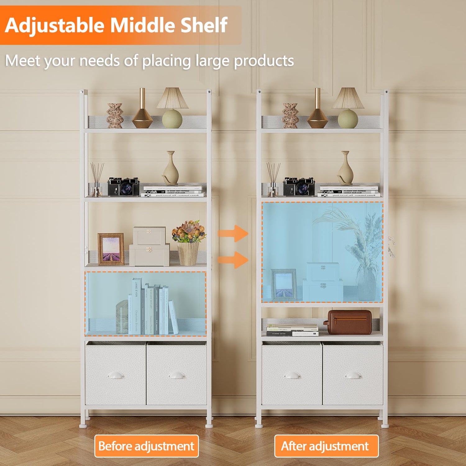 - [Adjustable Bookshelf]: This white bookshelf has 5 shelves, the height of the third shelf is flexible, which can meet the needs of placing larger items. You can use industrial bookcase to display books, crafts, game consoles, family albums, potted plants, ect. Great home organization for essentials and decorations.