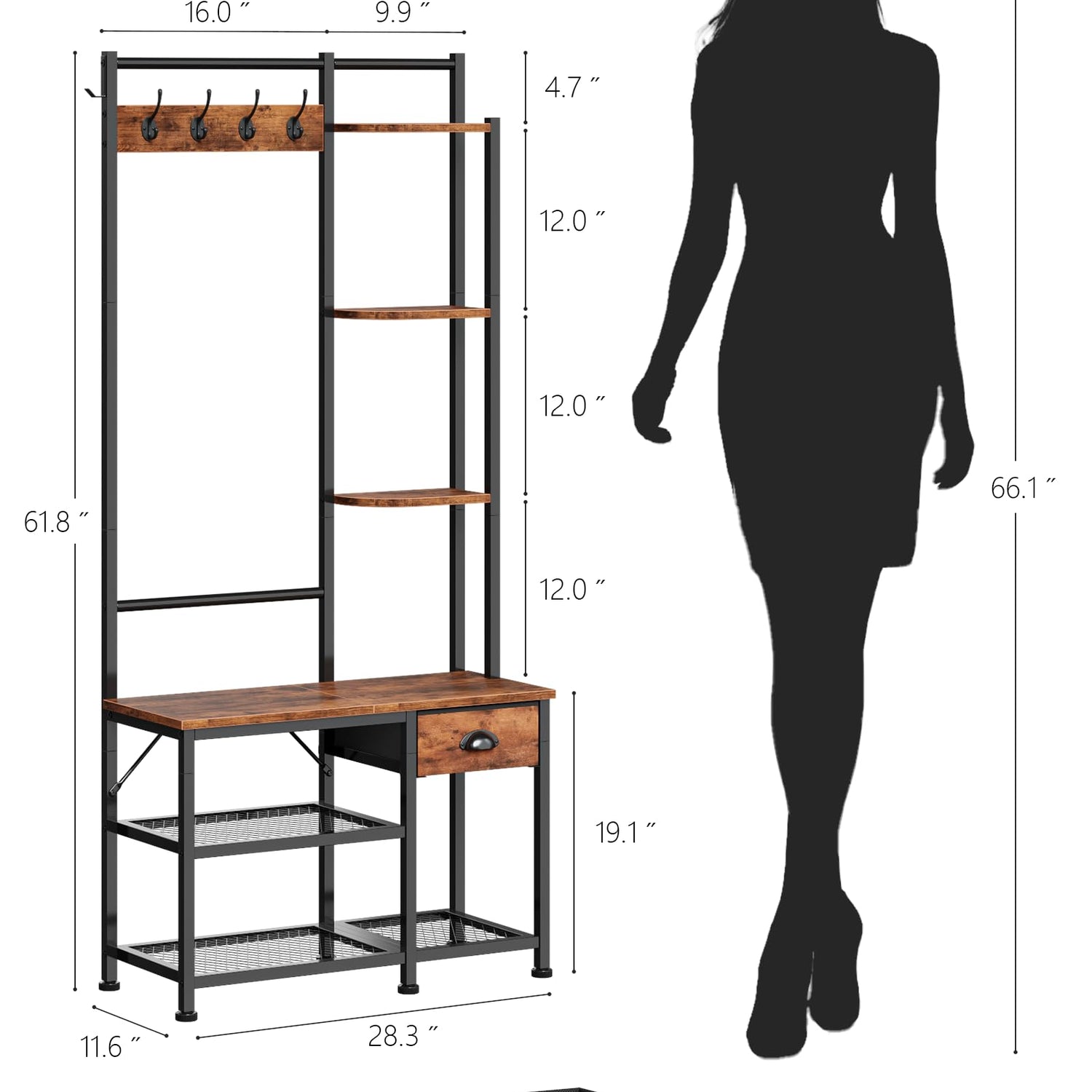 Furologee Coat Rack, Hall Tree with Bench and Shoe Storage, 4 in 1 Entryway Bench, Coat Rack with 3 Shelves and Drawer, Entryway Organizer with 5 Hooks for Hanging, Rustic Brown
