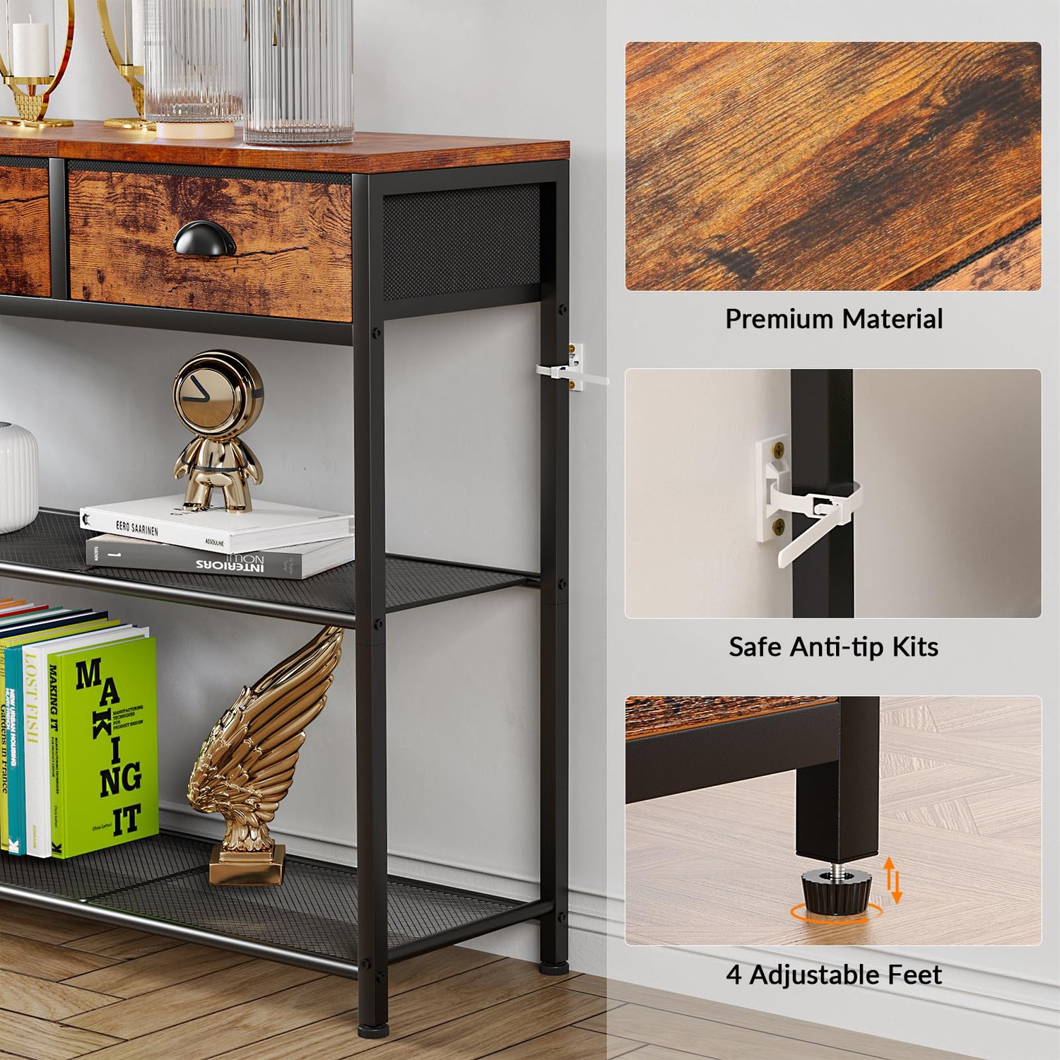 Rustic Brown 38'' Furologee Console Sofa Table with 3 Fabric Drawers and Storage Shelves