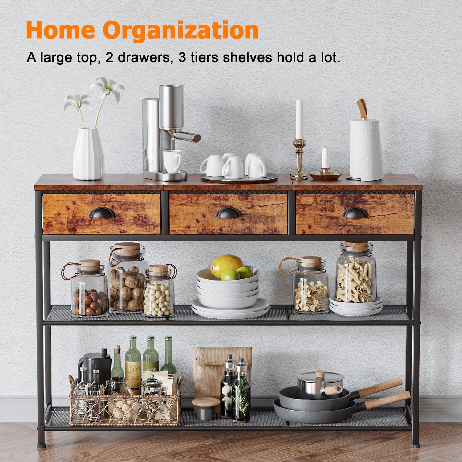 This multi-functional table is incredibly versatile, serving as an accent table, couch table, foyer table, entrance table, bar table, display shelf, front door table, TV stand, plant stand, coffee bar table station, or even a hallway table in your bedroom or kitchen. Its rustic brown finish complements a variety of home décor styles, making it a seamless addition to any room.
