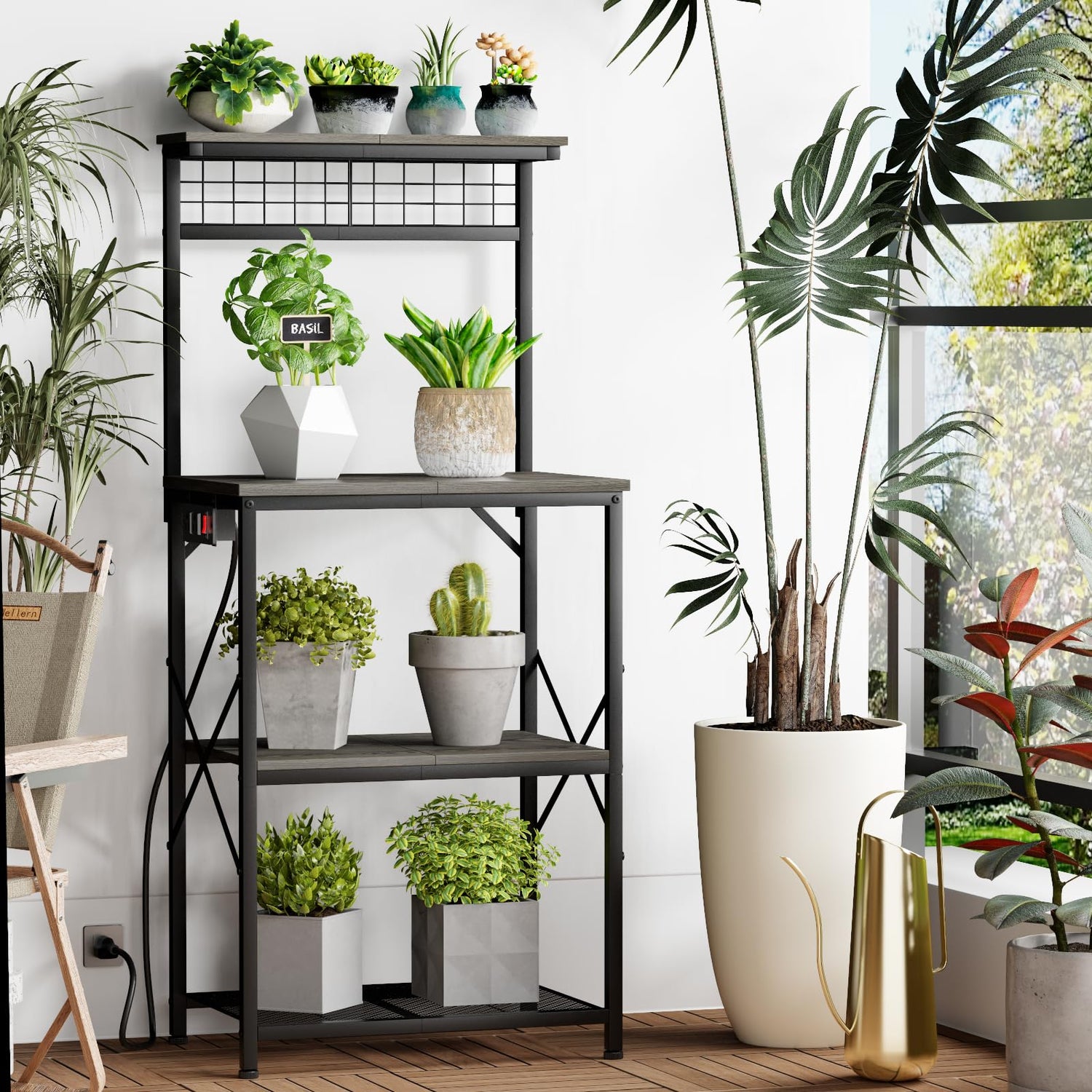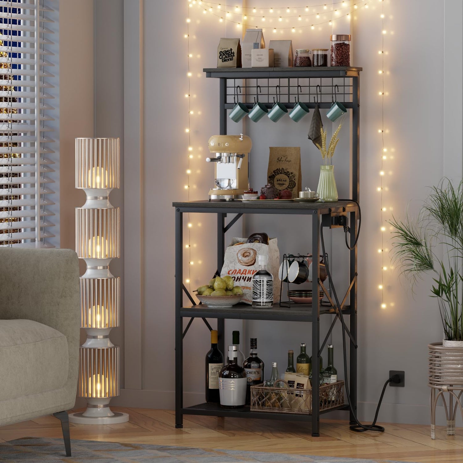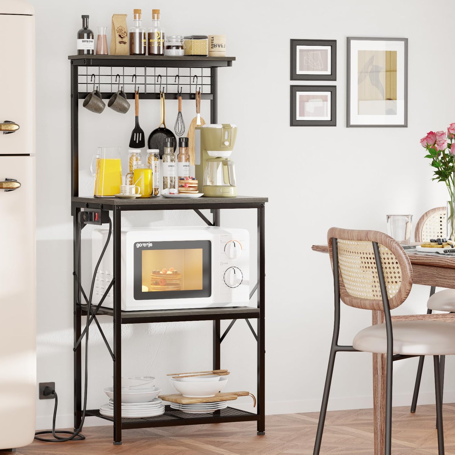 Furologee 4-Tier Kitchen Bakers Rack with Power Outlet & Storage – Black Oak Microwave Stand with S Hooks