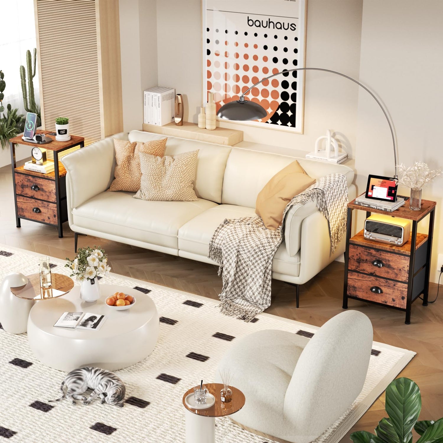 Furologee Nightstand with Charging Station, End Table with LED Lights, Bedside Table with USB Ports & Outlets, Night Stands with 2 Drawers, for Living Room/Bedroom