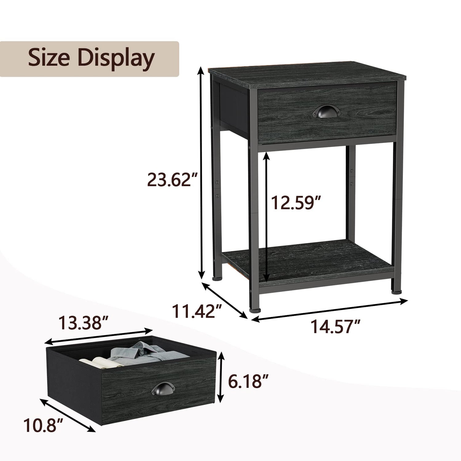 Furologee Nightstand with Fabric Drawer & Storage Shelf, Small Bedside Table Organizer for Small Space, 2 Tiers Industrial End Table, Side Table for Living Room, Bedroom, Black Oak