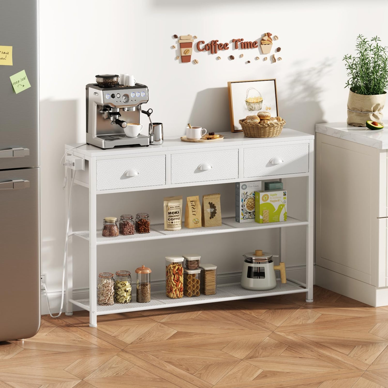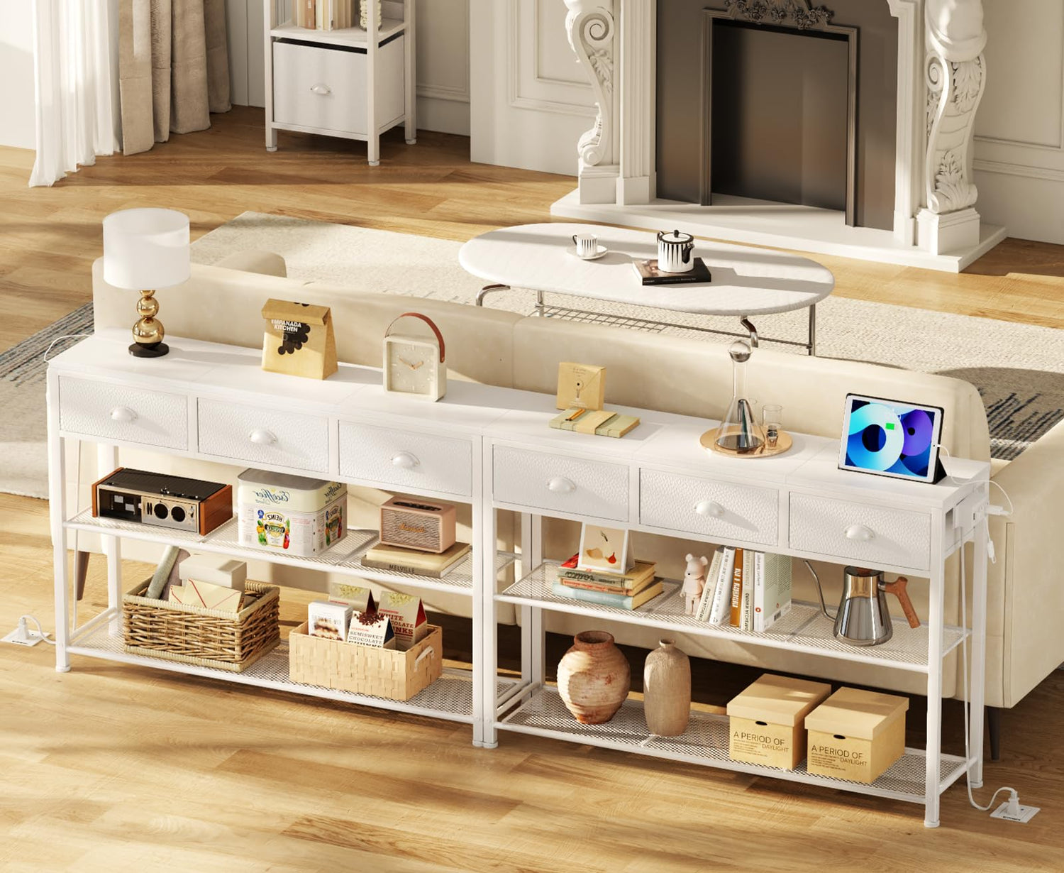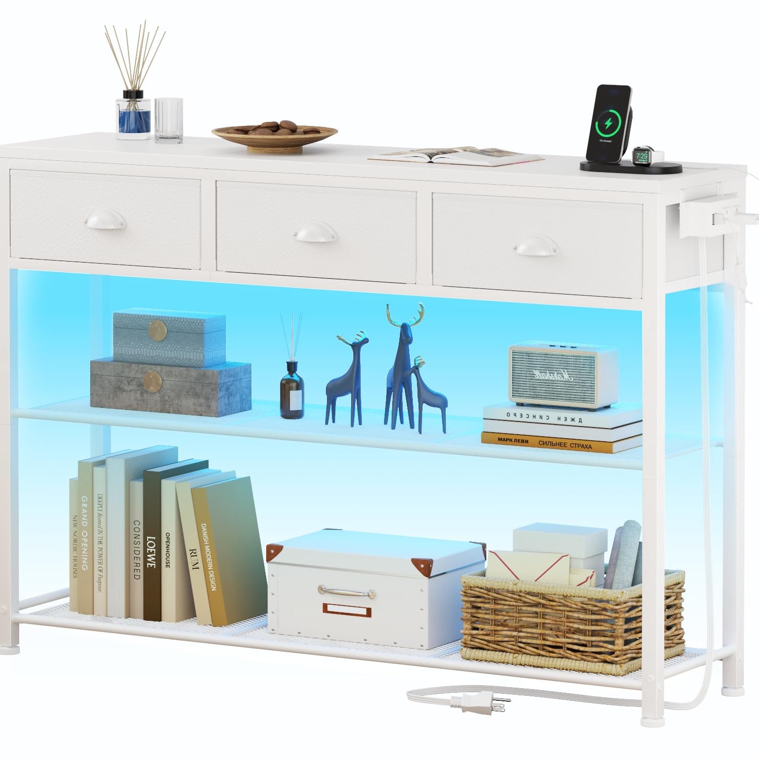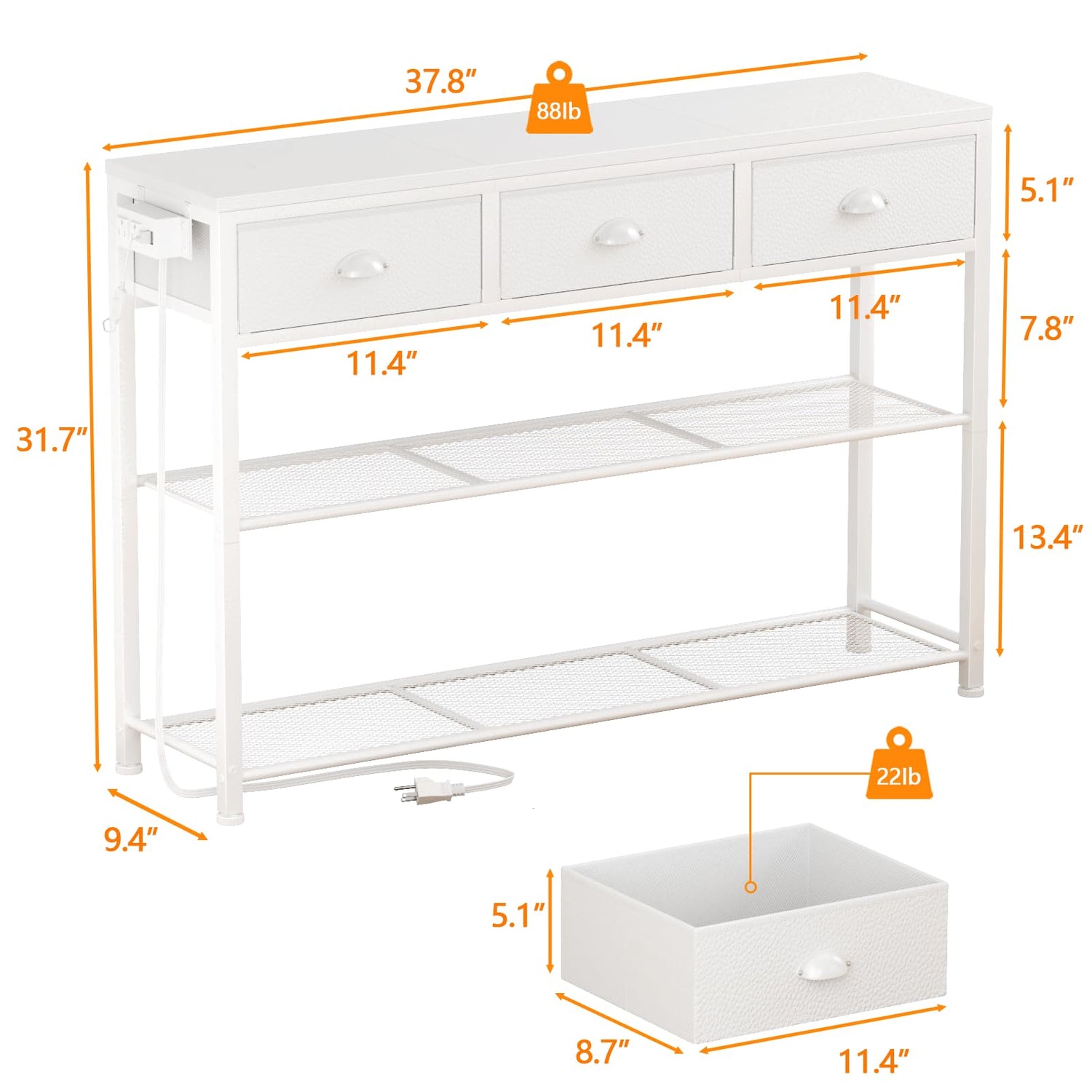 Details: Furologee White Console Table with Charging Station & 3 Fabric Drawers, 38'' Entryway Table with Storage Shelves and LED Light, Industrial Foyer Table for Entry Way, Display Shelf for Hallway