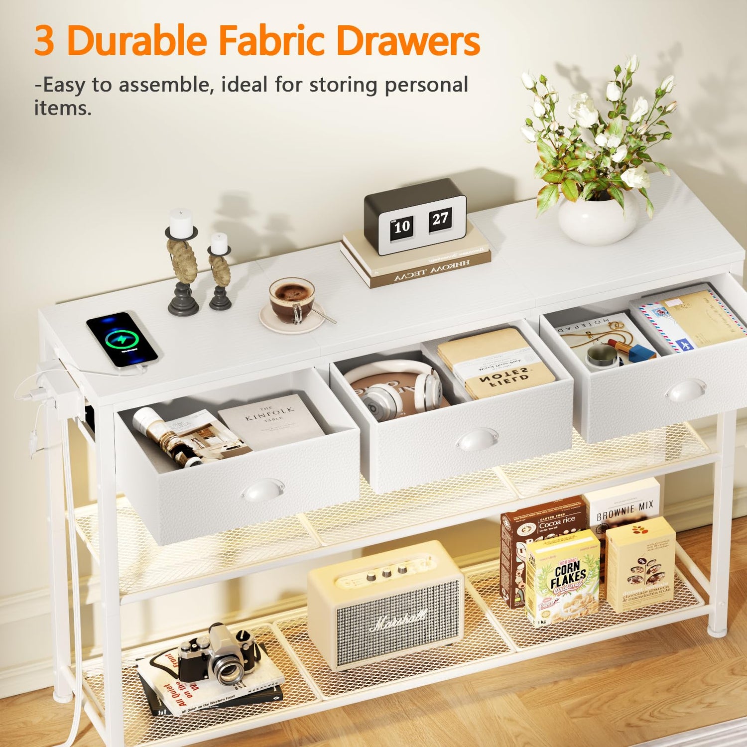 Furologee White Console Table with Charging Station & 3 Fabric Drawers, 38'' Entryway Table with Storage Shelves and LED Light, Industrial Foyer Table for Entry Way, Display Shelf for Hallway