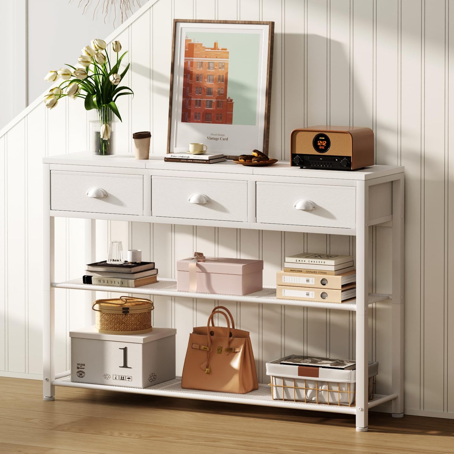 Furologee White Entryway Table, 38'' Console Sofa Table with 3 Fabric Drawers, Industrial Entry Way Table with Storage Shelves, Display Shelf for Living Room, Hallway, Entrance, Foyer