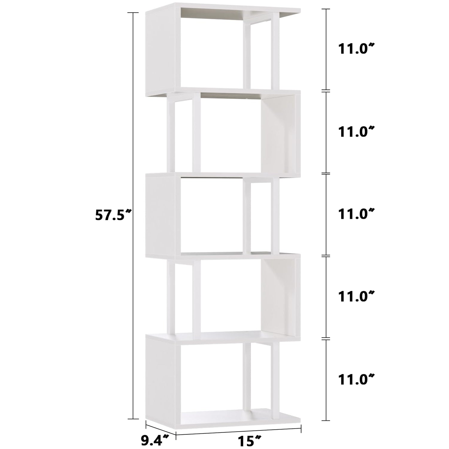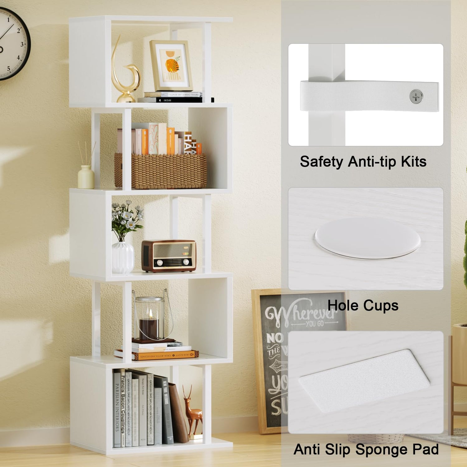- [Unique Geometric Bookshelf]: S-shaped design makes this tall white shelf a work of art, while provides large storage space, satisfies various daily needs. Each of the 6 shelves is divided into 2 compartments, perfect for organizing books, collectibles, plants, albums, and other items in a neat and orderly manner