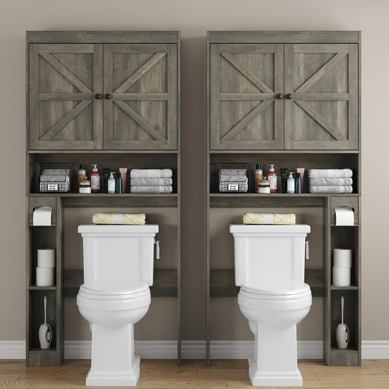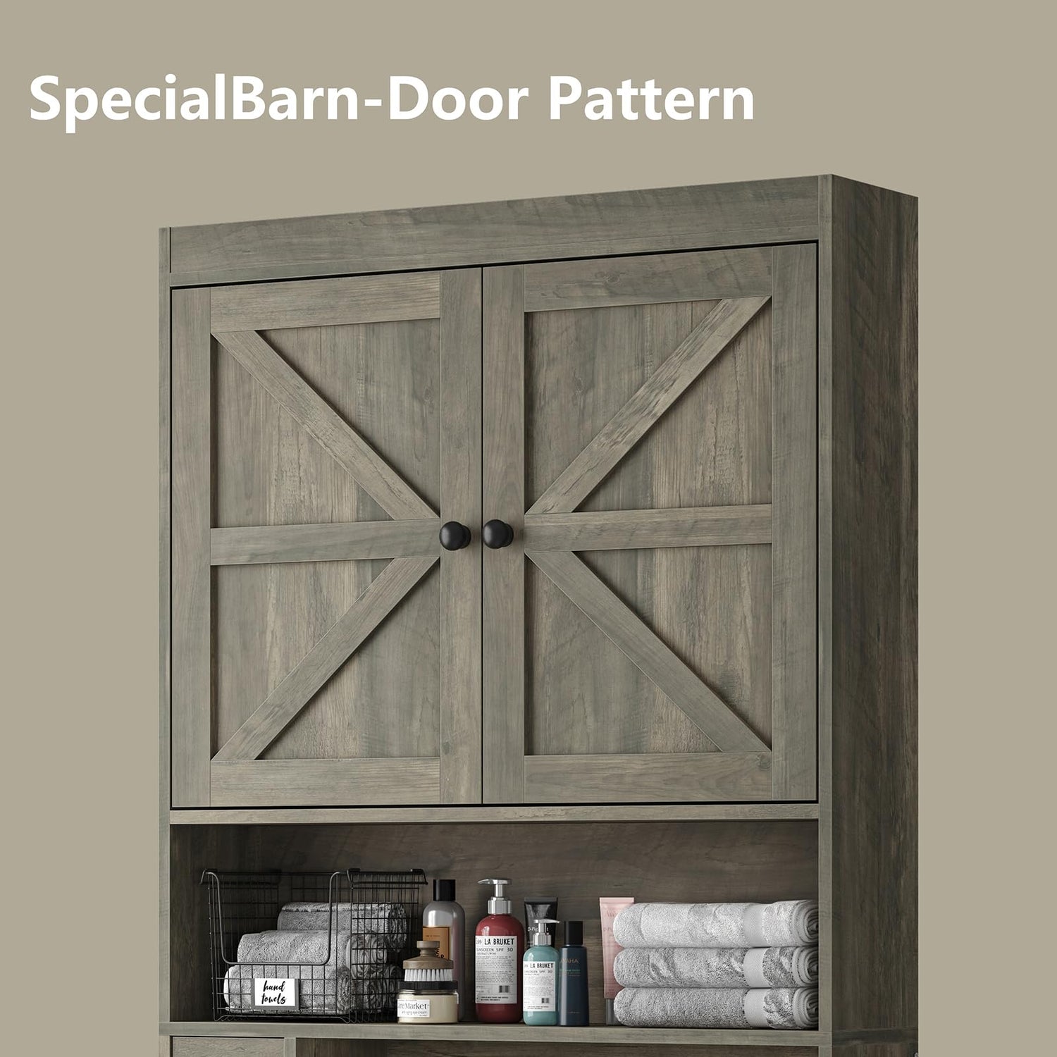 furomate 32.3''W Over The Toilet Storage Cabinet with Barn Doors, Over Toilet Shelf Farmhouse Storage Cabinet Space Saver with Toilet Paper Holder & Adjustable Bottom Bar, Gray