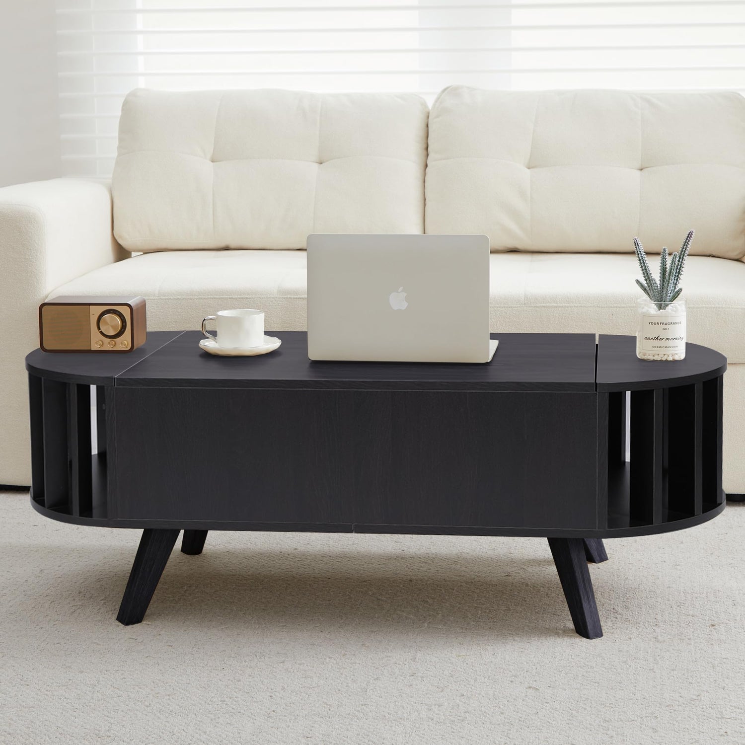 FurSch Wood Lift Top Coffee Table with Hidden Storage, 47.24" Oval Lift Table Top Curved Profile Design Conversation Table for Living Room, Office (Black)