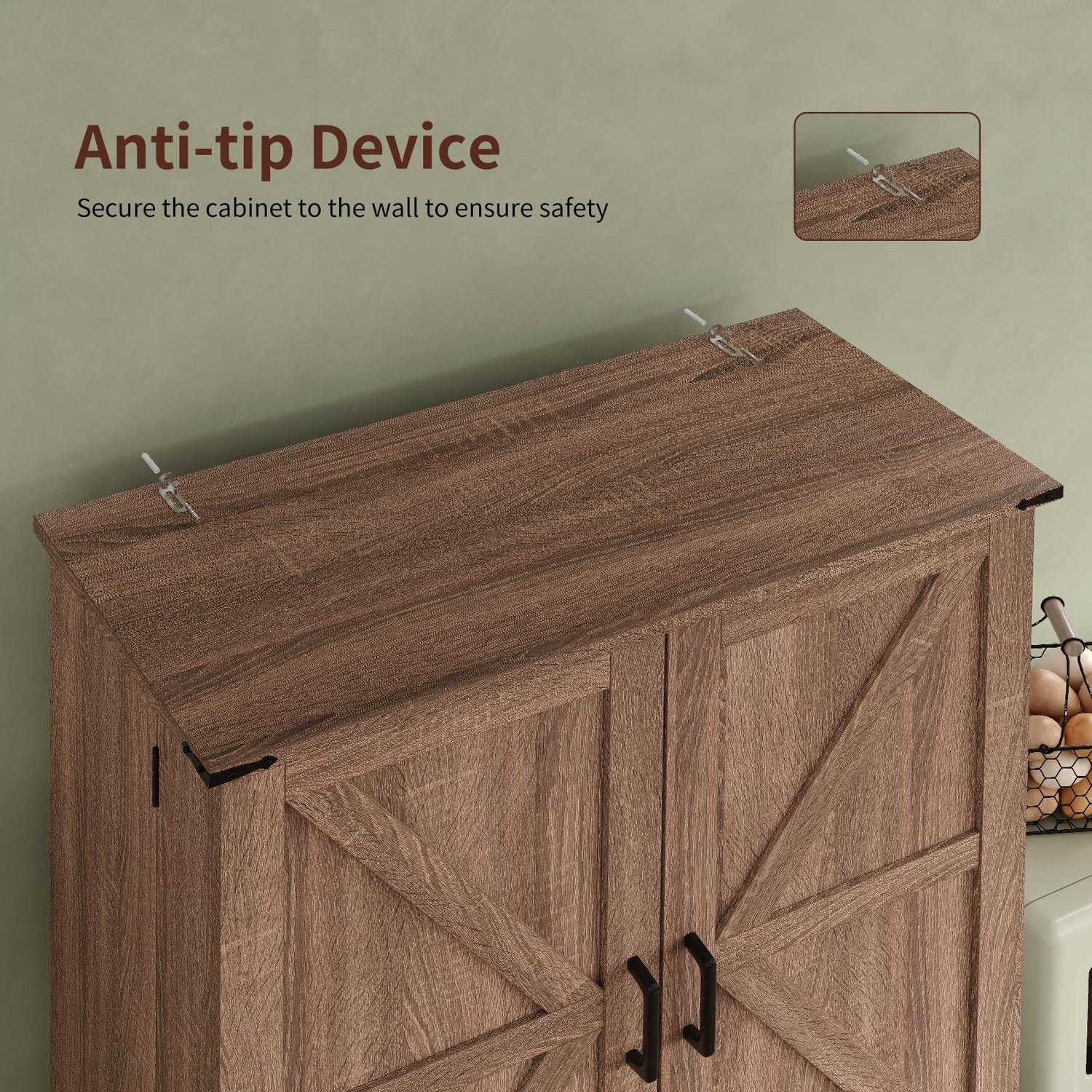 - Retro and Elegant Design: Kitchen pantry cabinet has espresso as the overall color tone. The design of the cabinet door draws on the old barn door and adds a wide black metal handle, which blends with the metal decoration on the top, exuding a retro yet stylish unique temperament, no matter where you place it, it will become the focus of attention