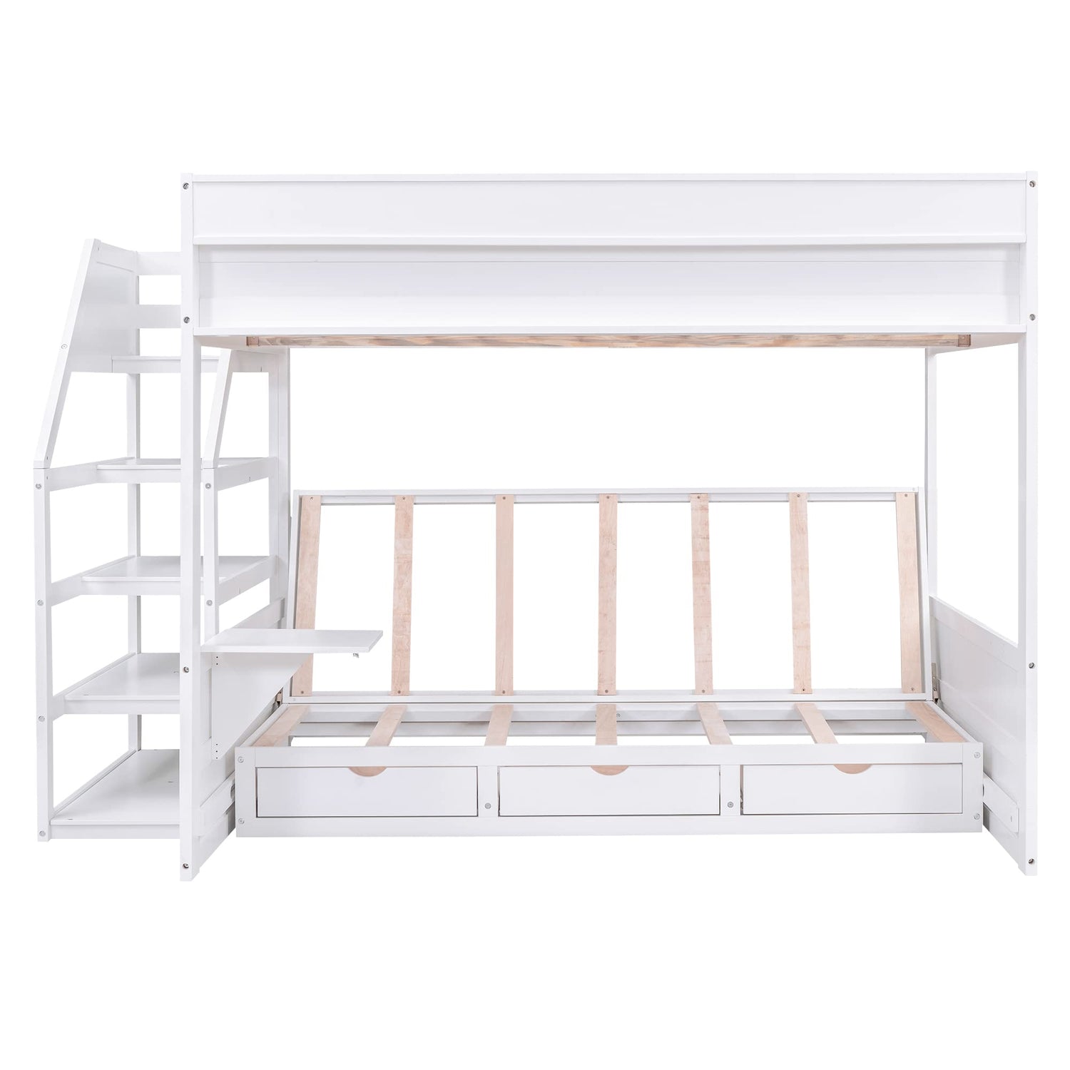 Futon Bunk Beds with Stairs,Full Over Full/Futon Bunk Beds with 3 Storage Drawers & Small Table,Bottom Bed Can Be Converted Into Daybed,Wood Full Loft Bed Frame for Kids Teens,White