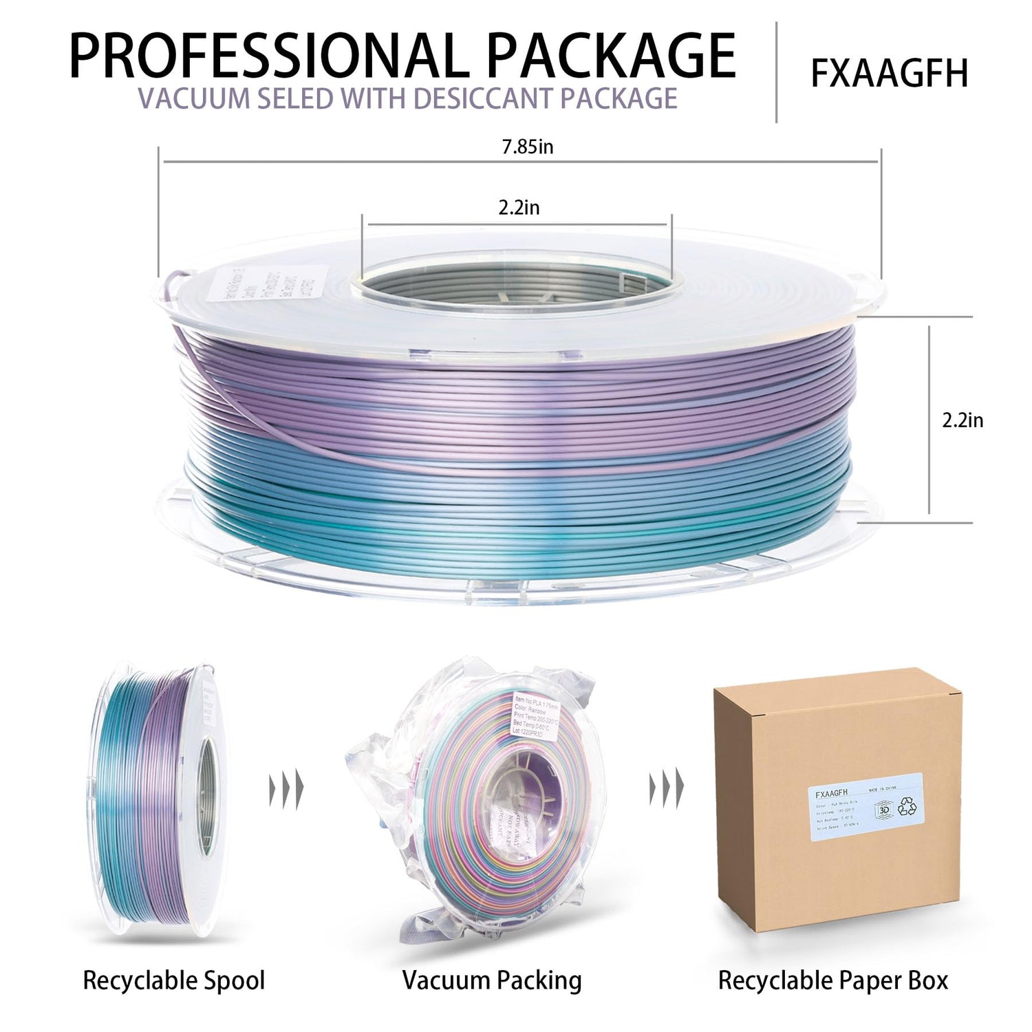 Details: FXAAGFH 1KG 3D Printer Filament 1.75 mm Rainbow Color, Shining 3 D PLA Printing Filament +/-0.03mm, 2.2lbs Silk PLA