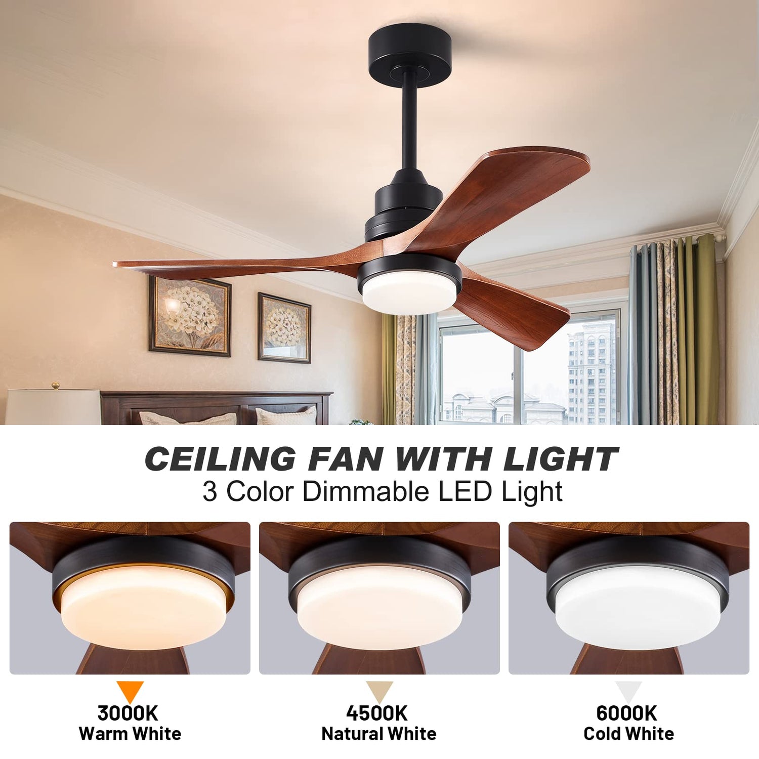 FXZZ 42" Wood Ceiling Fans with Lights and Remote, Quiet Reversible DC Motor and 3 Color LED Light, 3 Blades 6 Speed Ceiling Fan for Farmhouse Living Room Bedroom Dining Room Workroom Study