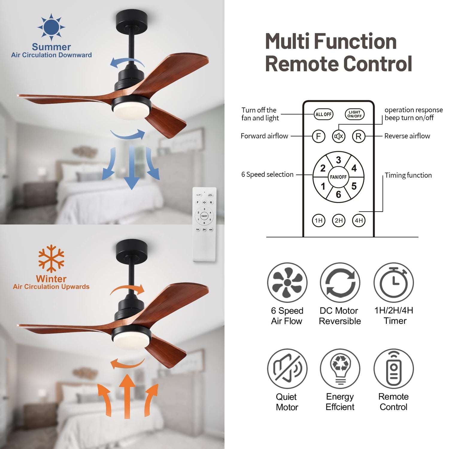 - 【Quiet Reversible DC Motor】Our variable frequency DC motor use choice silicon steel pure copper, save more than 75% energy compared to traditional AC motors, bringing strong air volume while being quieter(Low gear speed below 20 dB). Reversible function keep you cool in summer and increase warm air circulation in winter, Suitable for bedroom, dining room, living room, workroom, study, office.