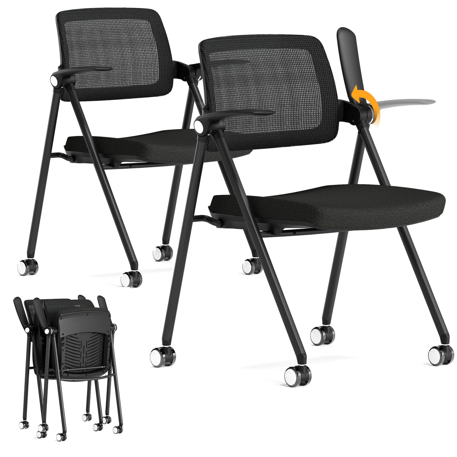 FYLICA Stackable & Foldable Office Chair Set of 2, Folding Desk Chair with Flip-Up Armrest, Breathable Mesh, Thick Seat Cushion & Rocking Backrest, Conference Room Chair with Wheel (Black)