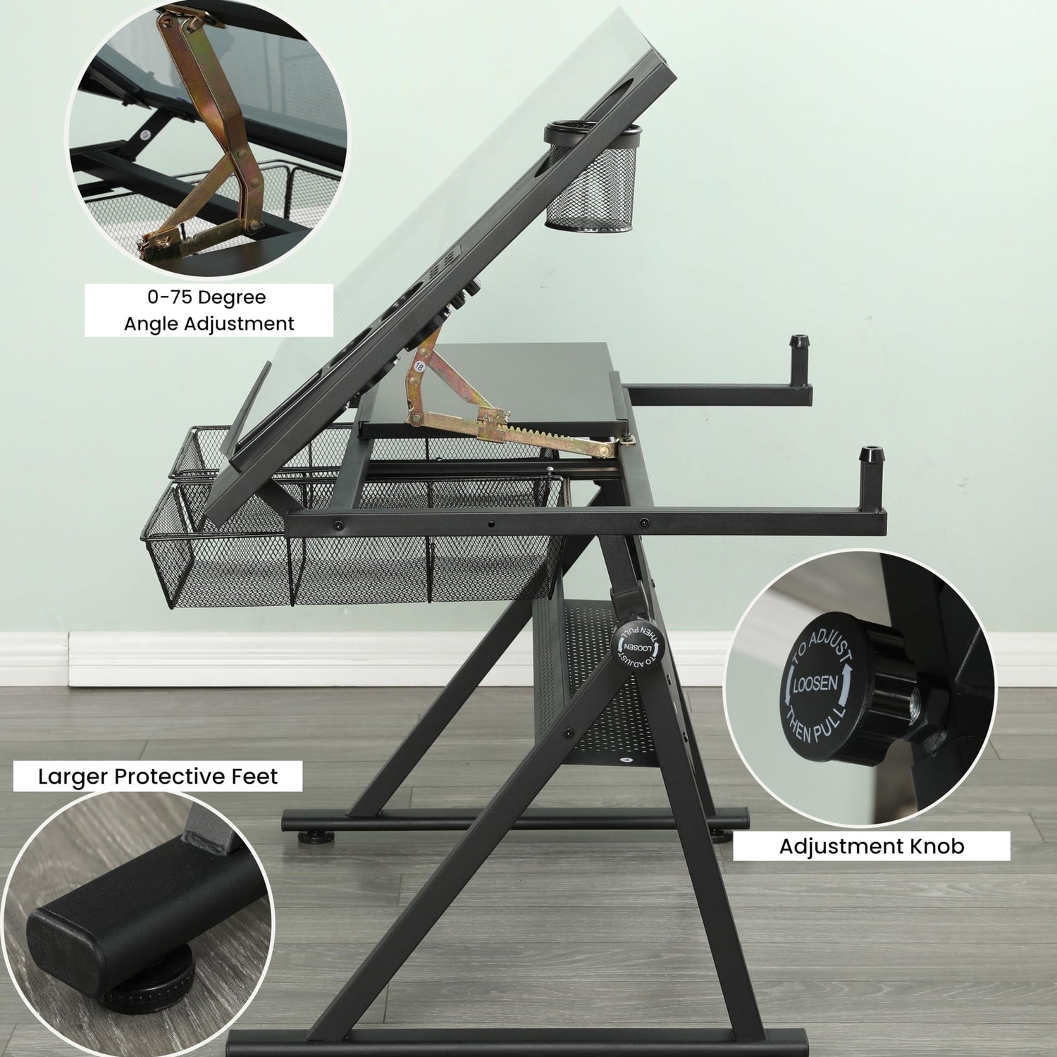 Gaderth Drafting Table w/Stool, Height Adjustable Drawing Table, Multifunctional Art Craft Paintings Work Station w/2 Storage Drawers Artists Desk Tilting Glass Tabletop for Home Office, Black