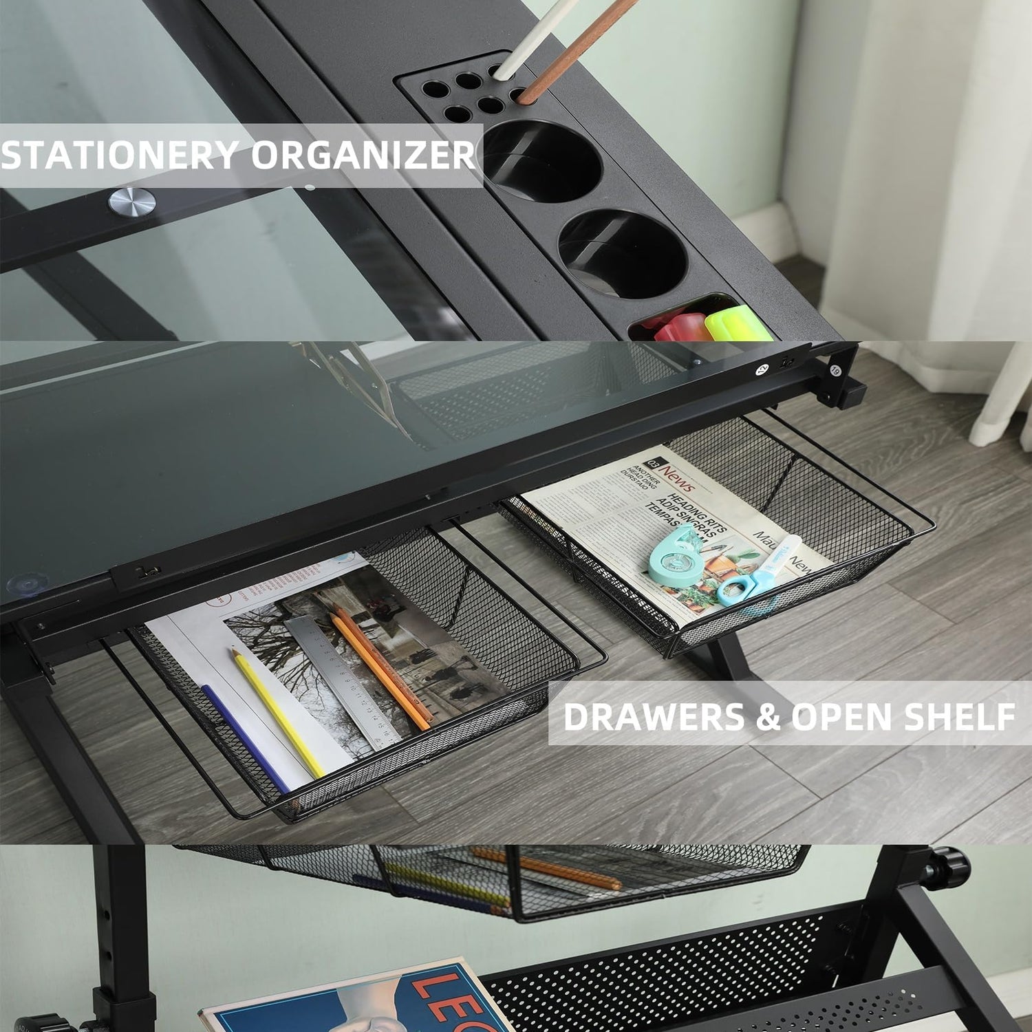 - 🎨Sturdy and Stylish Construction:Crafted with a high-quality full-transparent glass surface and supported by a sturdy powder-coated steel frame, this drafting table not only looks elegant but is built to last. The nonwoven drawers provide convenient storage for your art supplies, making it ideal for artists, designers, and hobbyists alike. Plus, the accompanying stool features strong steel legs, ensuring you have a stable seat while you work on your masterpieces.