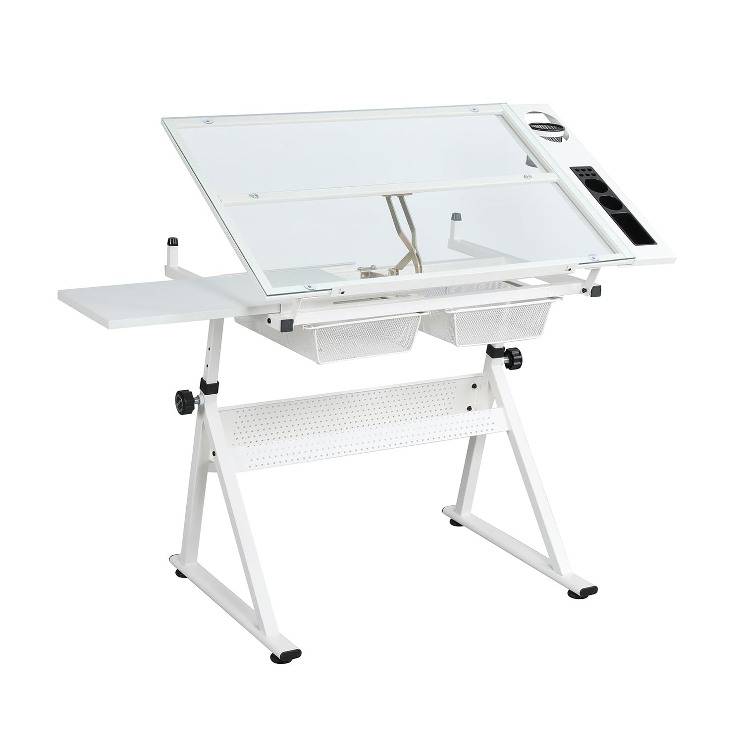- 🎨Sturdy and Stylish Construction:Crafted with a high-quality full-transparent glass surface and supported by a sturdy powder-coated steel frame, this drafting table not only looks elegant but is built to last. The nonwoven drawers provide convenient storage for your art supplies, making it ideal for artists, designers, and hobbyists alike. Plus, the accompanying stool features strong steel legs, ensuring you have a stable seat while you work on your masterpieces.