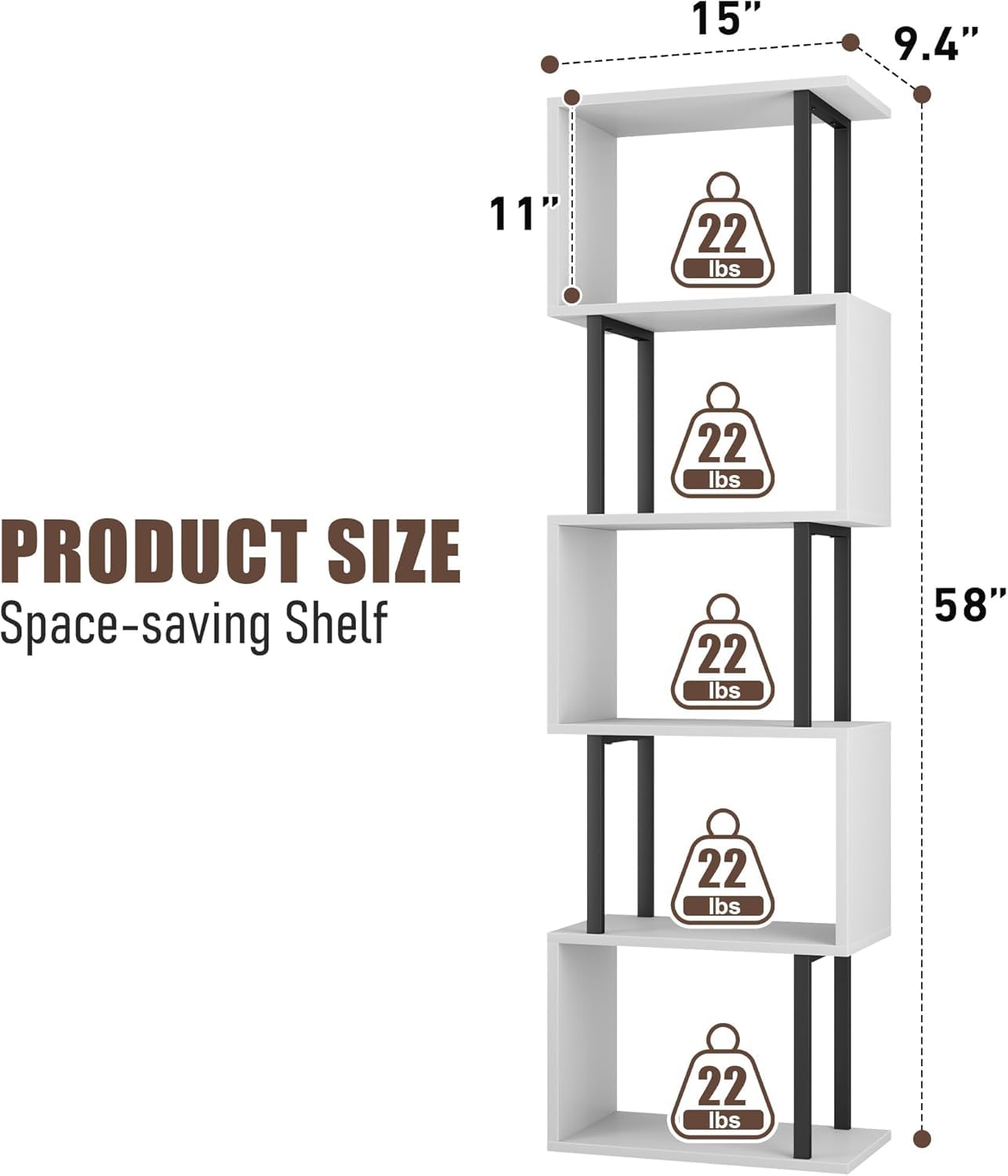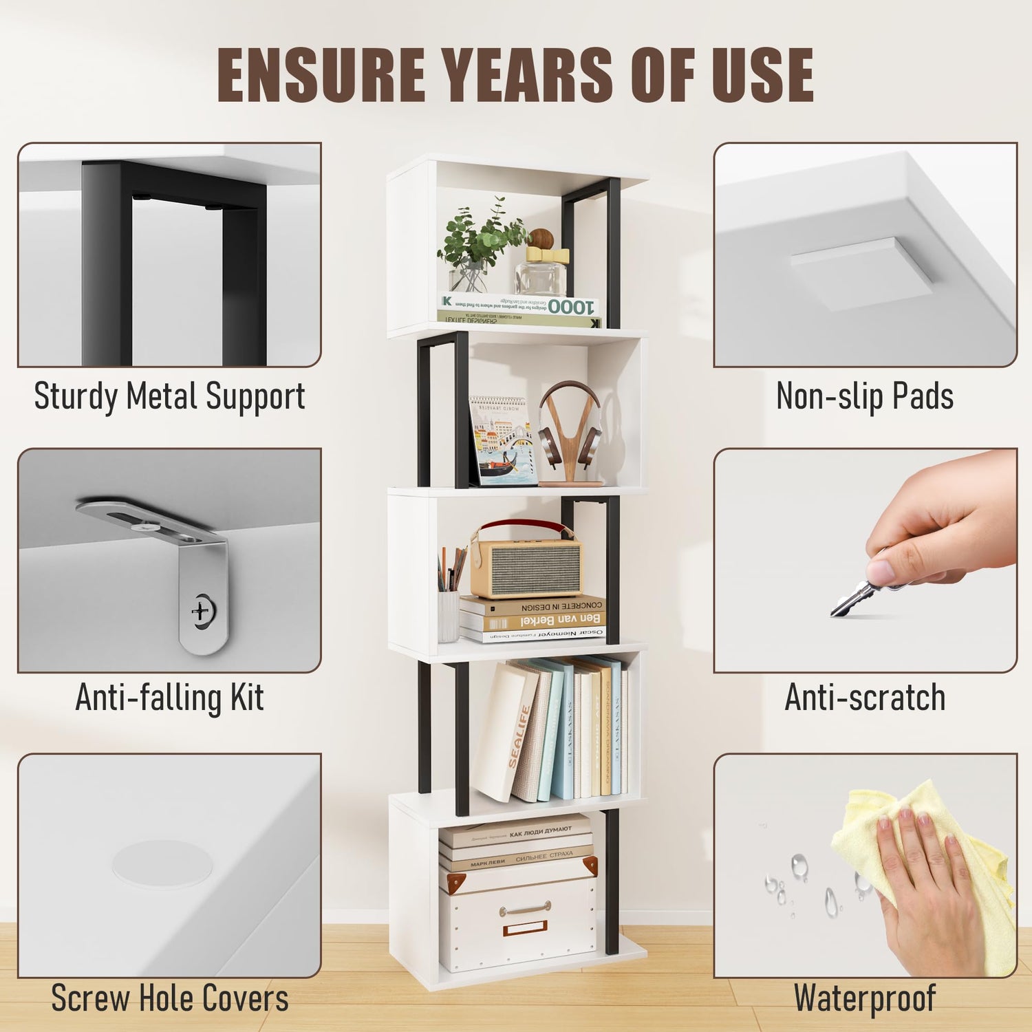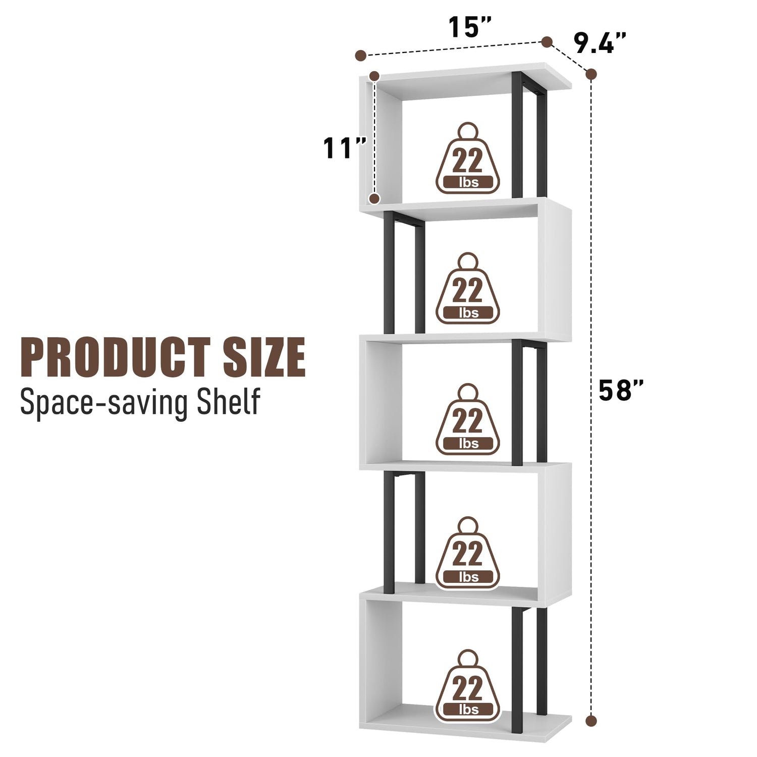 Gadroad 5-Tier Bookshelf, Narrow S-Shaped Geometric Bookcase, Wood Decorative Storage Shelving, Modern Freestanding Display Shelves, Book Shelf Unit for Living Room Bedroom Home Office, White