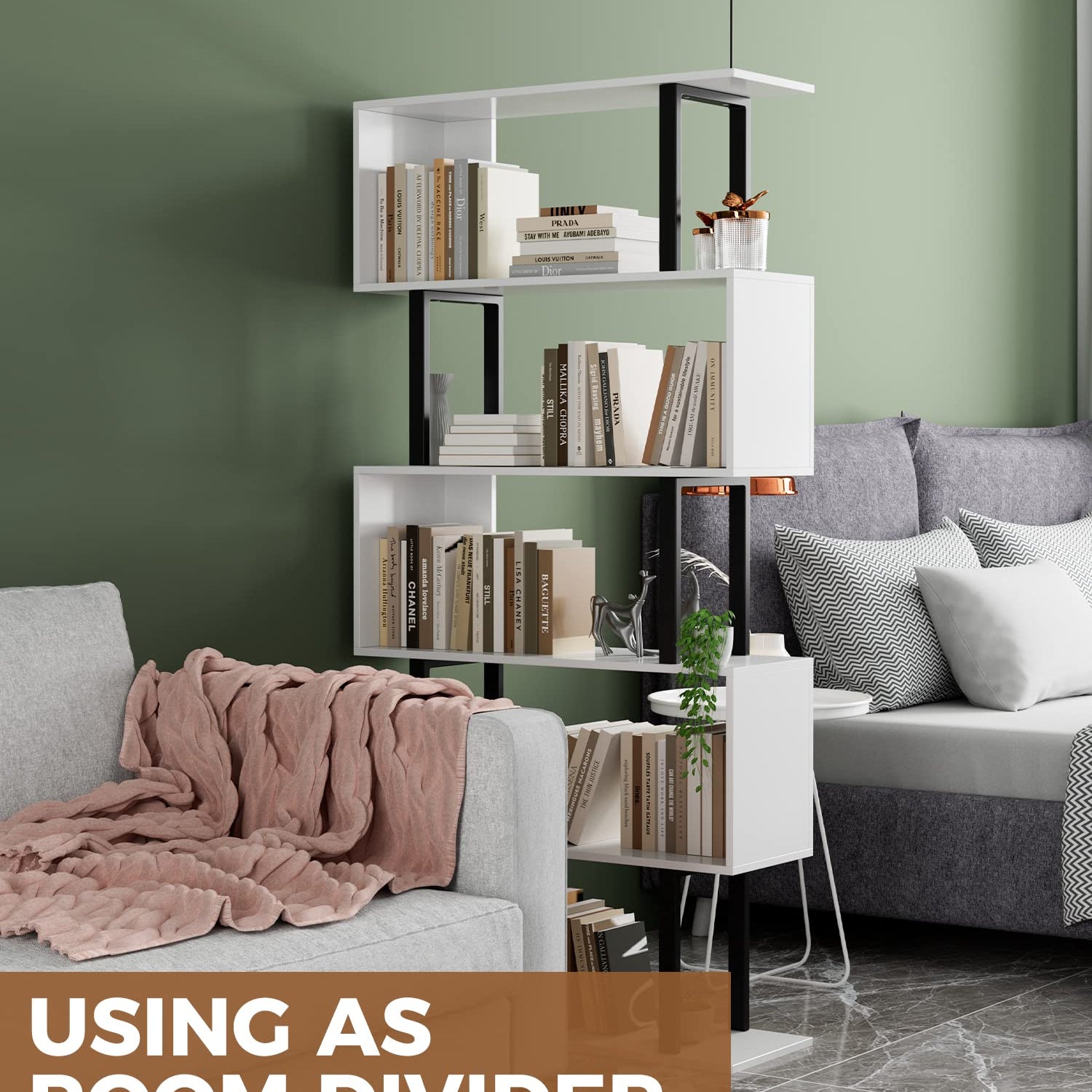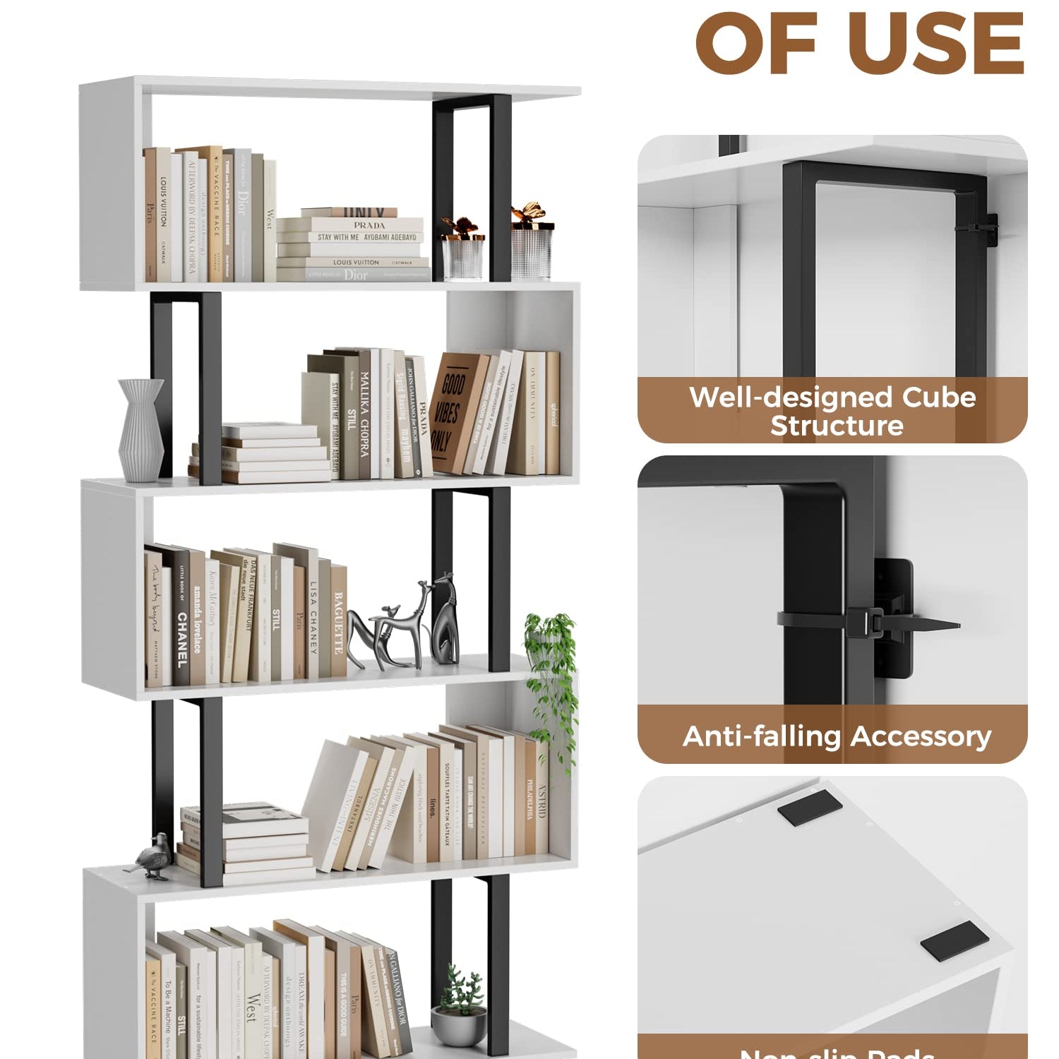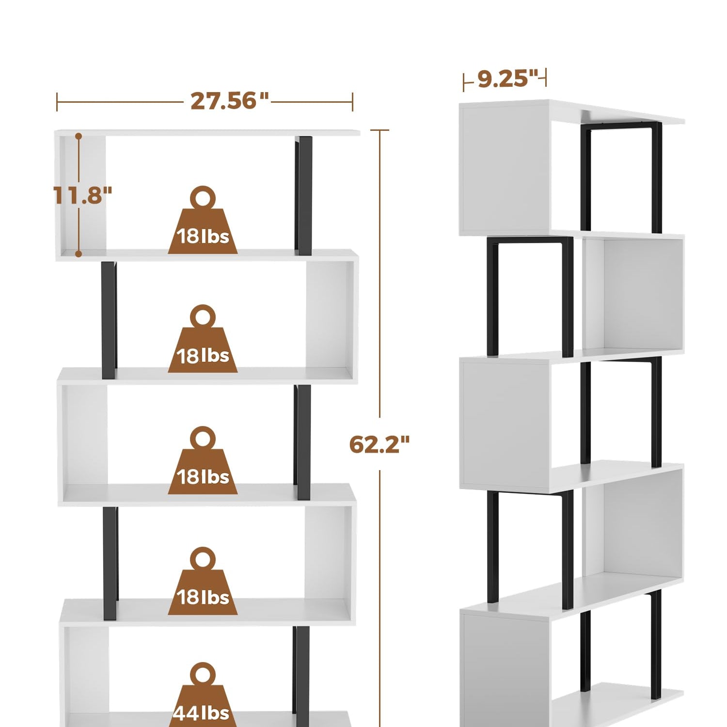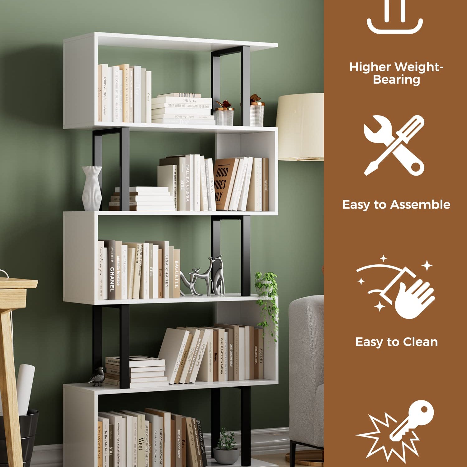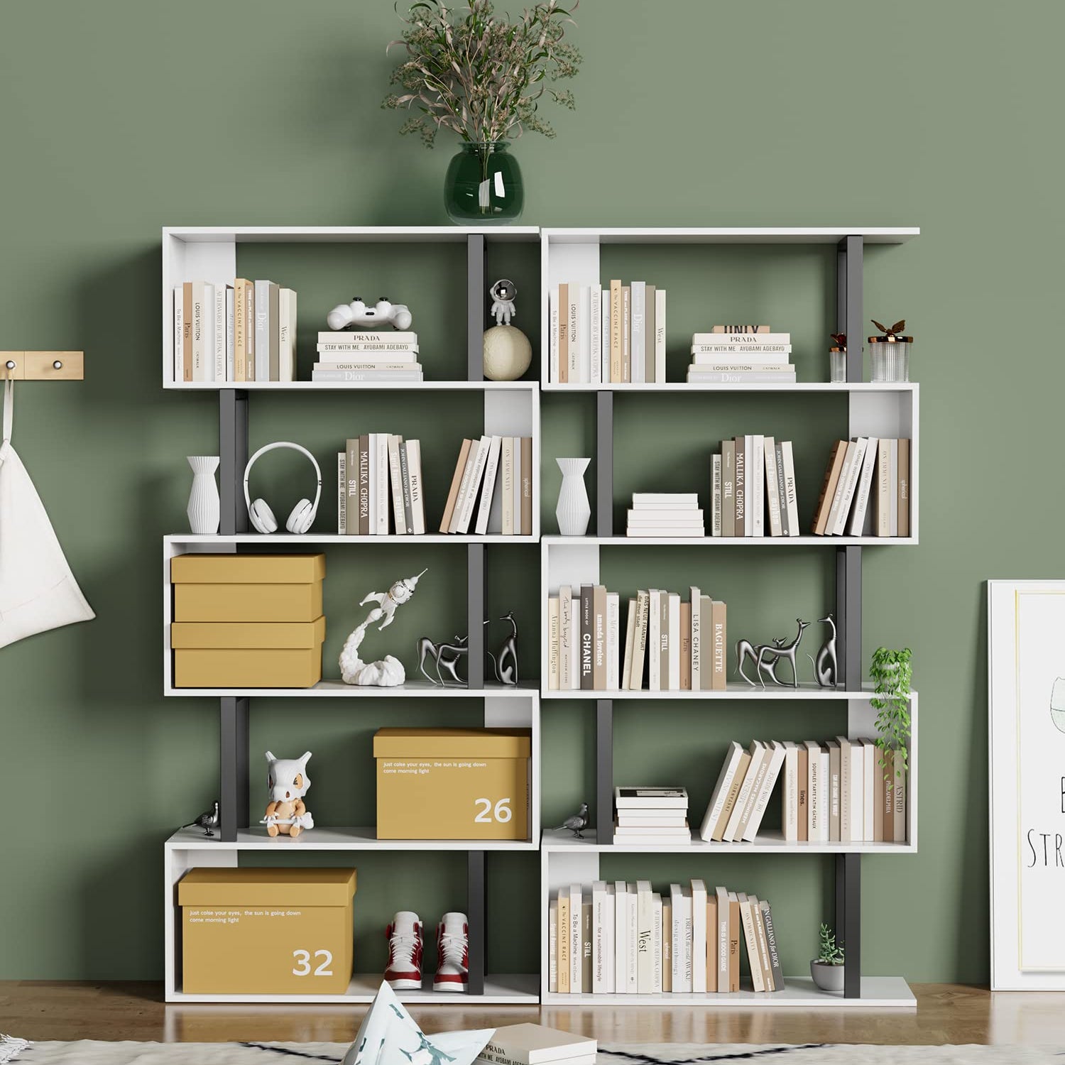 Gadroad 5 Tier Geometric Bookcase,S Shaped Bookshelf, Wood Decorative Storage Shelving, Modern Freestanding Display Shelves, Tall Book Shelf Unit for Living Room Bedroom, White