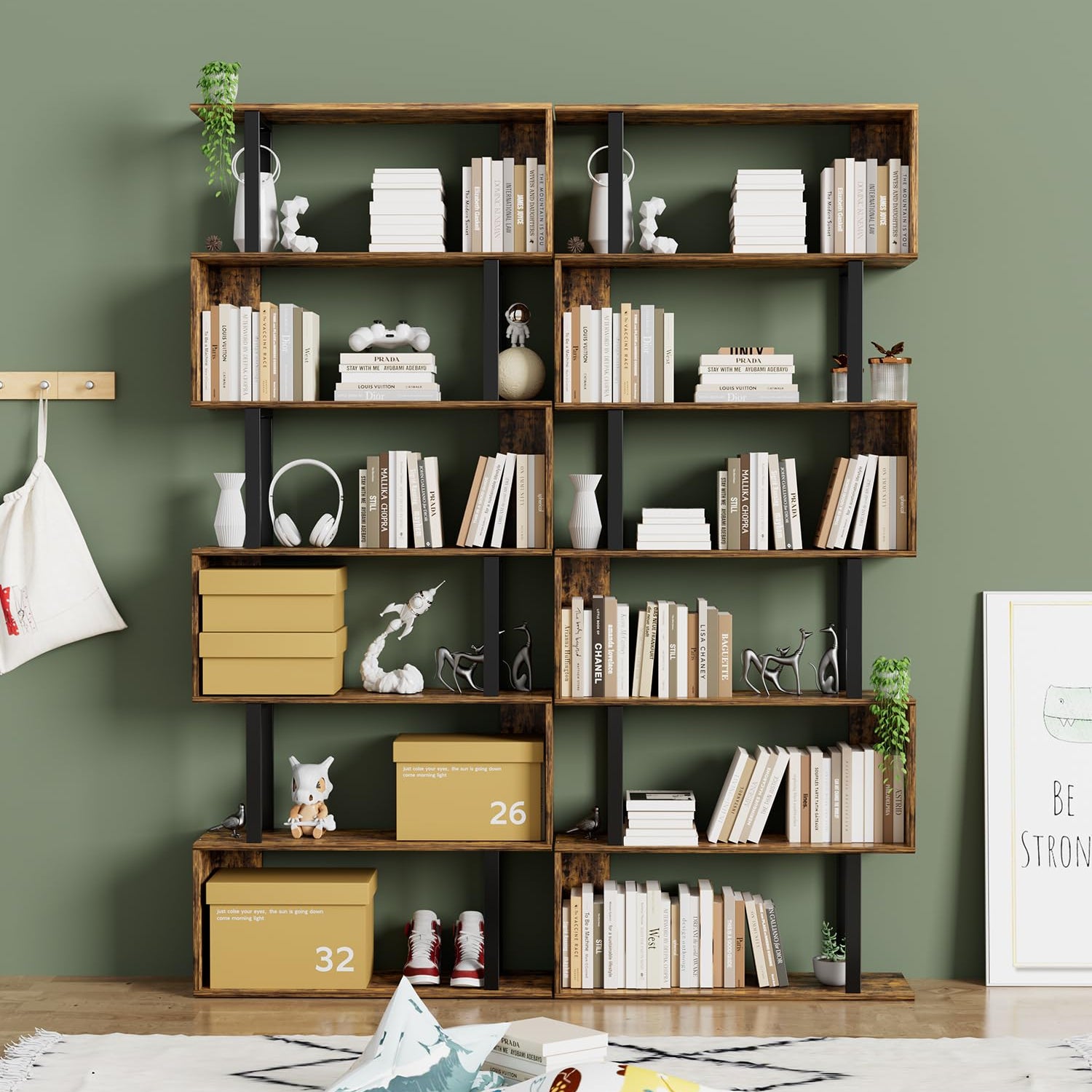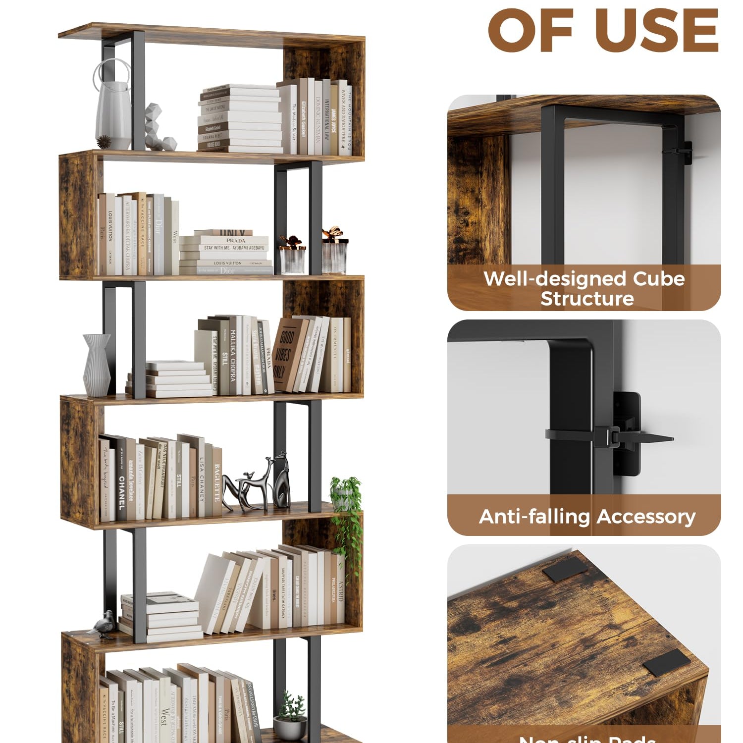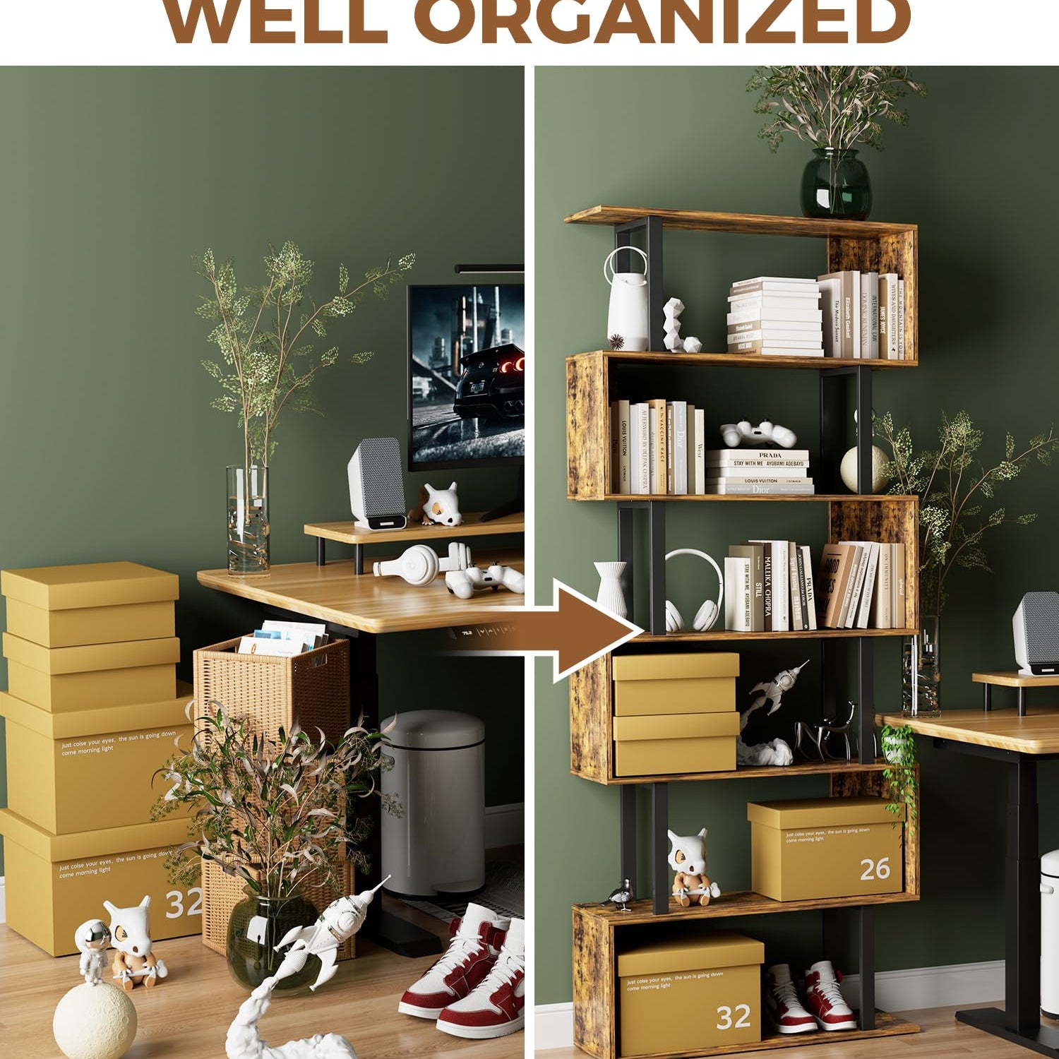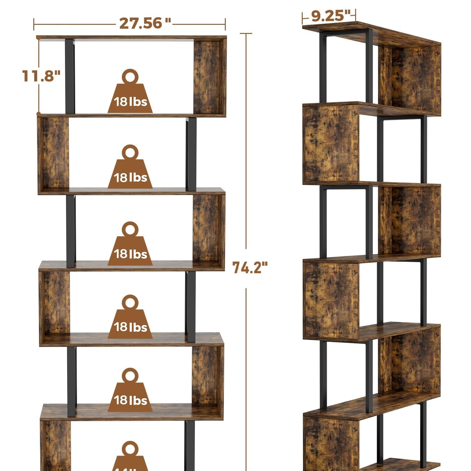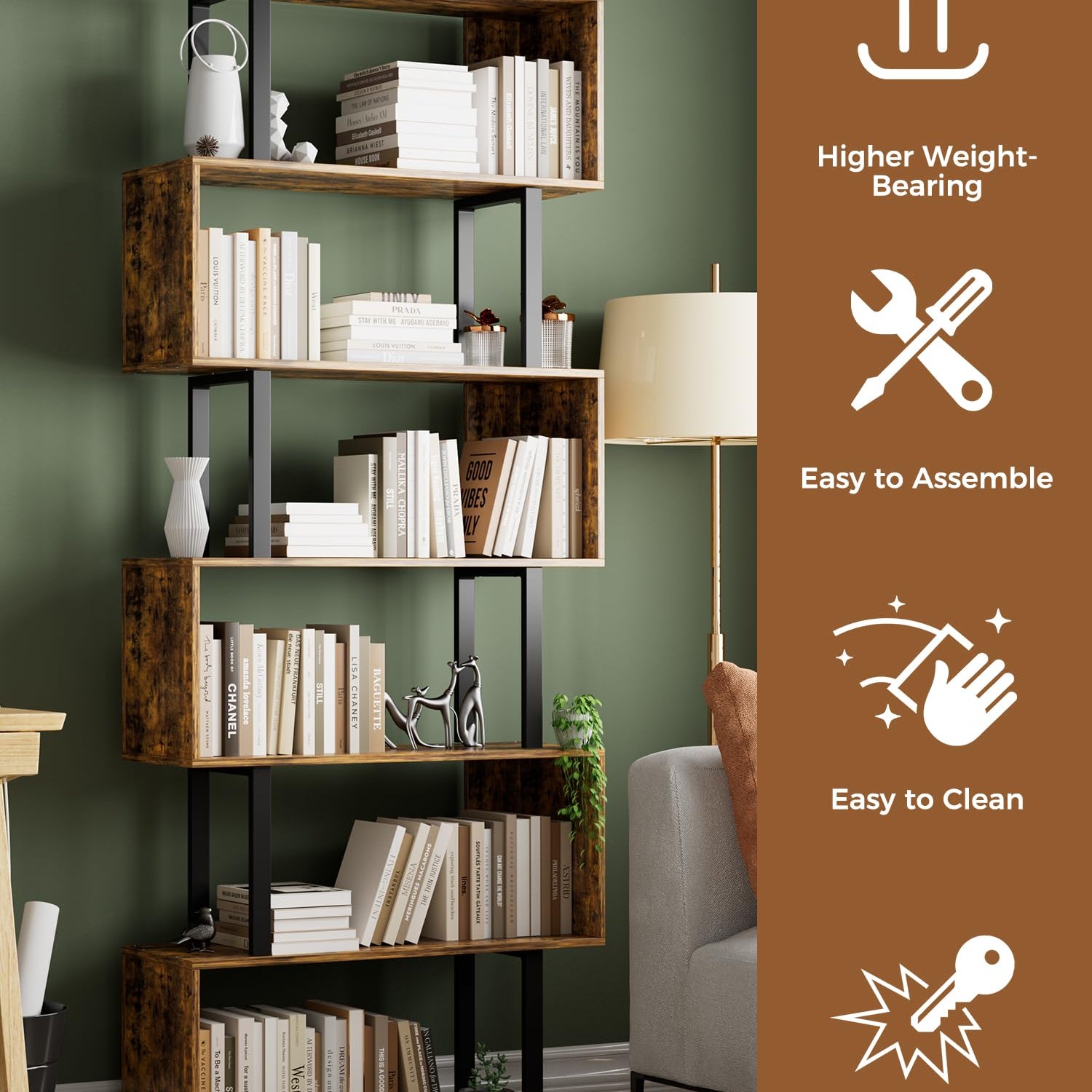 Gadroad 6 Tier Geometric Bookcase,S Shaped Bookshelf, Wood Decorative Storage Shelving, Modern Freestanding Display Shelves, Tall Book Shelf Unit for Living Room Bedroom, Rustic Brown