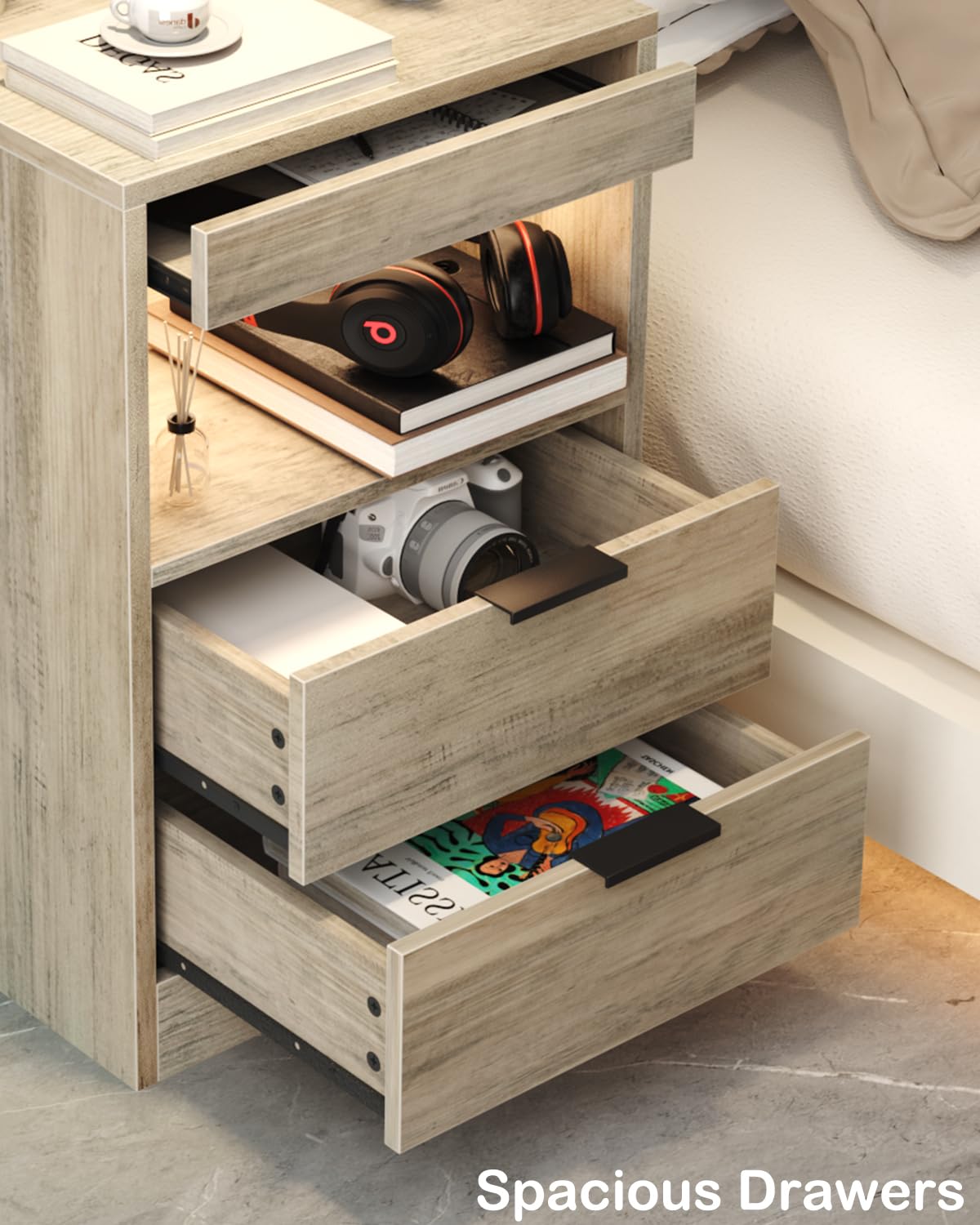 Gadroad LED Nightstand with Charging Station, Bedside Table with 3 Drawers and LED Lights, End Table Sofa Couch Side Table with Pull-Out Shelf, Grey