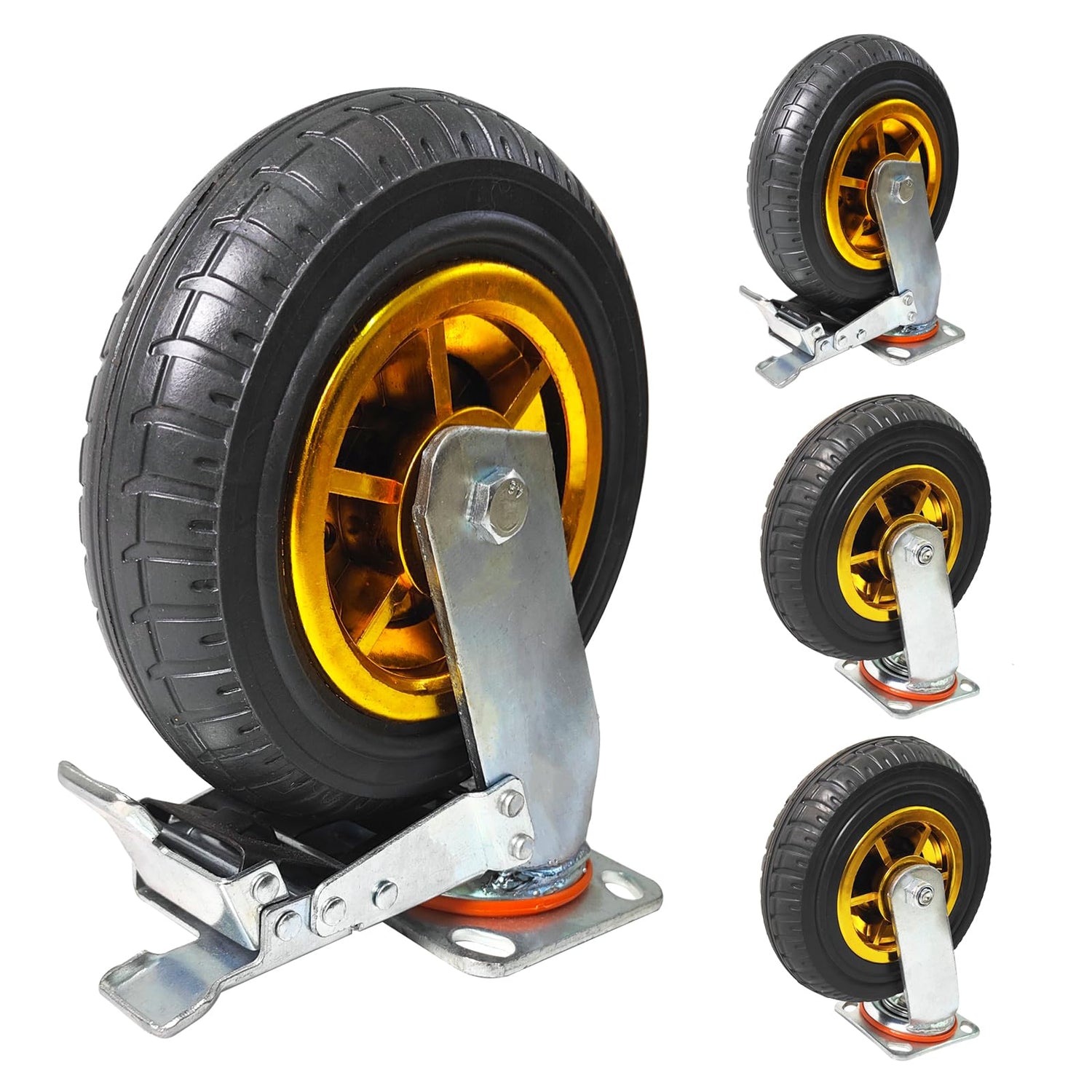 - 8 INCH SET OF 4 CASTERS: This set (4 swivels and 2 with brake ) features swivel and lockable along with 8 inch diameter knobby tread wheel to allow you to lock the wheel spin & position while to transport a heavy load with minimal effort even over rough terrain.