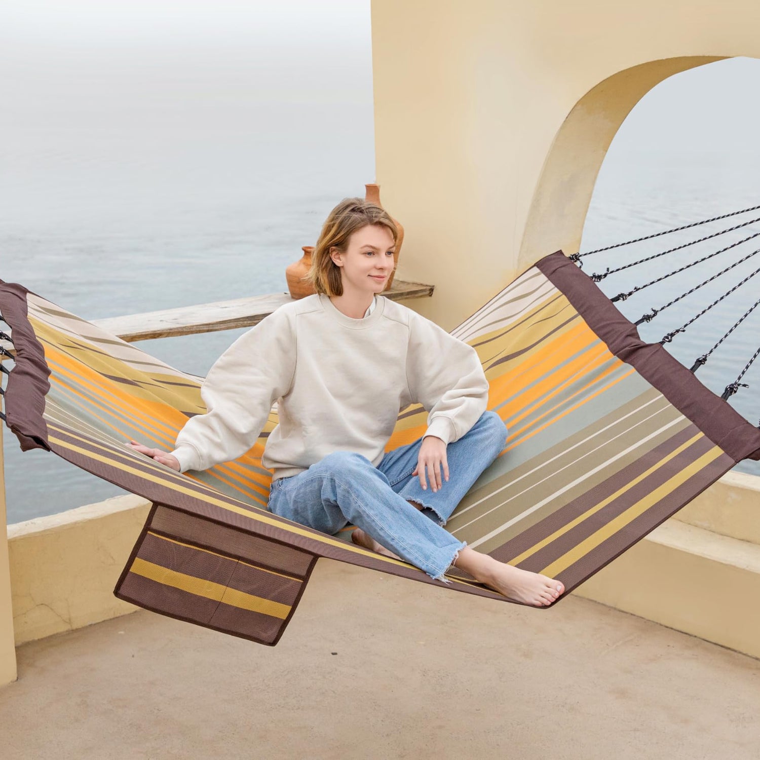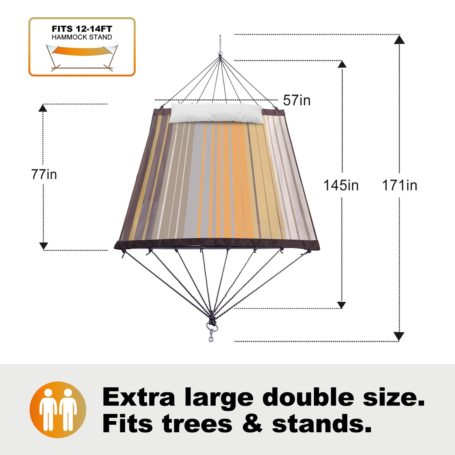 - ✅DOUBLE HAMMOCK & SPACIOUS ENOUGH TO SHARE: The comfort that comes with extra space is vital to us, and its size also boasts a wider range of versatility, allowing it to be hung from a 12-14ft hammock stand (not included) or used outdoors on its own.The hammock bed's dimension is 77" L * 57" W, the length from chain to chain is 14', larger than other quilted hammocks.
