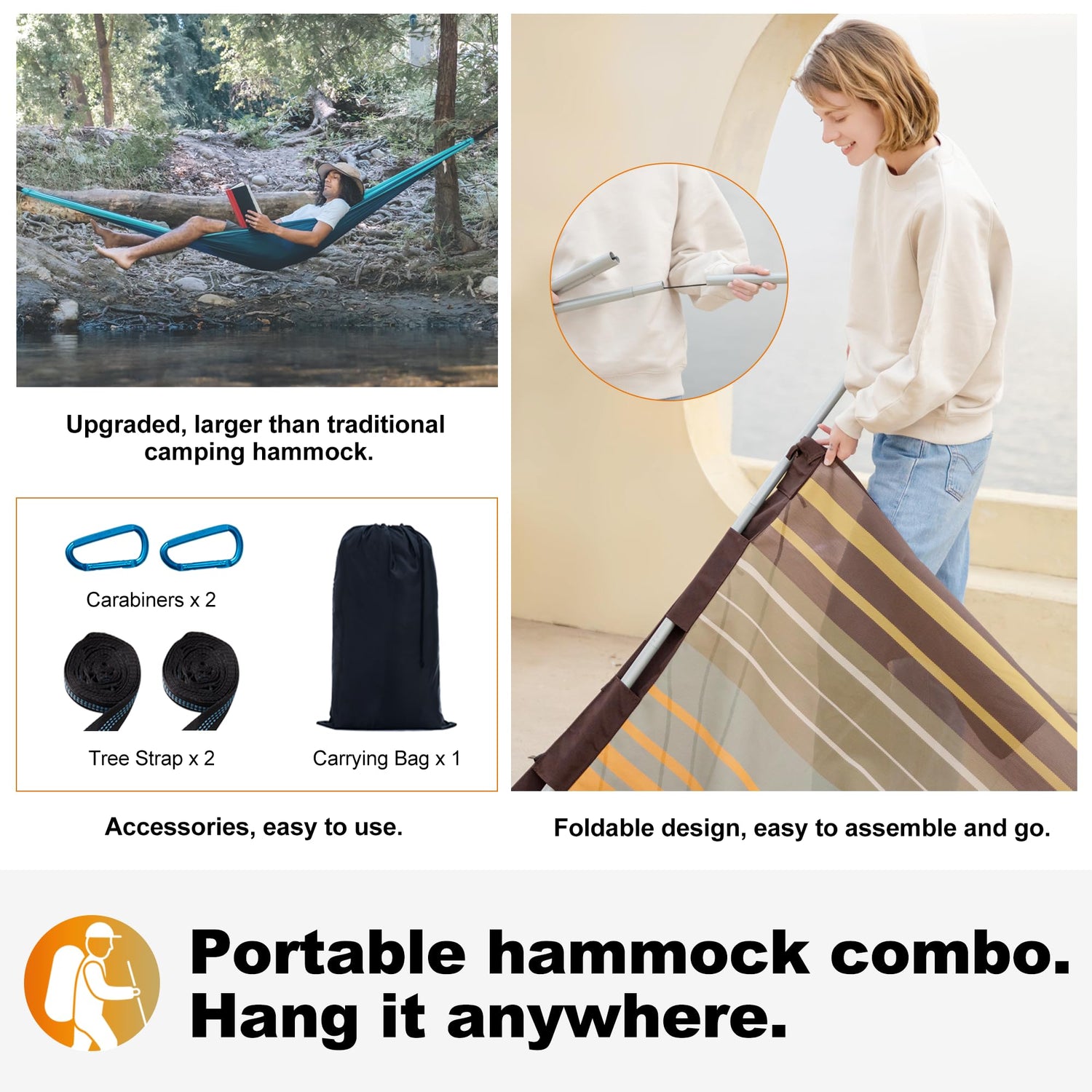 Details: PORTABLE CAMPING ALSO & EASY TO USE: You can hang it from a 12-14f t hammock stand (not included) or between trees by adjusting the position of the chain. Portable carrying bag & tree Straps & carabiners & forOutside, indoor, Patio, Backyard, Balcony and outdoor.