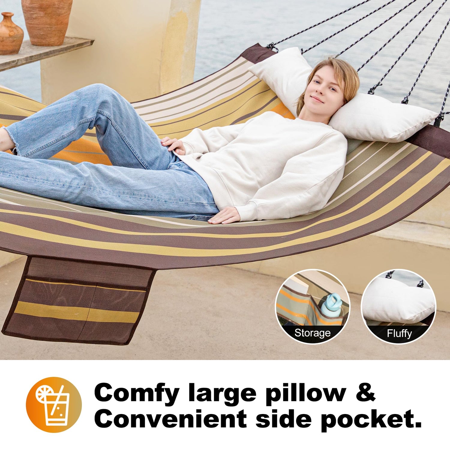 GAFETE 14ft Two Person Outdoor Hammock, Portable Camping with Folding Steel Spreader Bar, Carrying Bag, Carabiners, Tree Straps, Pillow & Sidebag, Quick Dry Textilene, 550 lbs Capacity (Coffee)