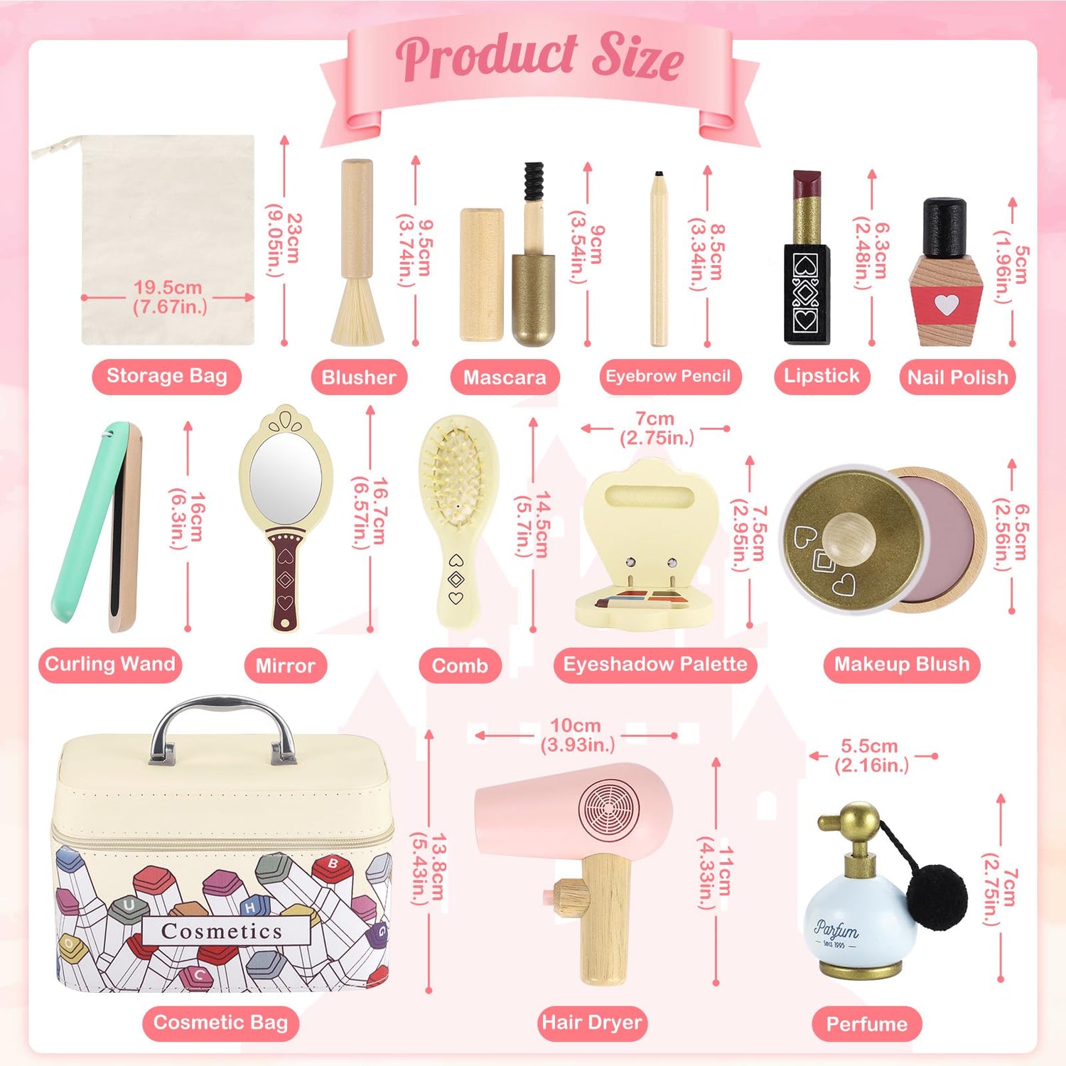- 【WOODEN MAKEUP TOY SET INCLUDES】This is 2 in 1 play set, with Wooden Makeup toolings and Barber Hair Salon accessories. including 15 pieces:puff,mirror, comb, hair dryer, curling iron, eyeshadow palette, nail polish, blurher, lipstick, makeup brush, mascara, eyeliner and perfume,storage bag and storage case.