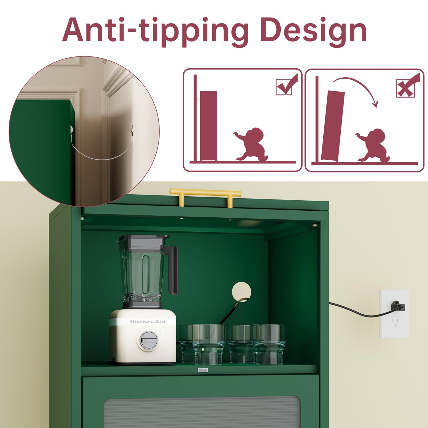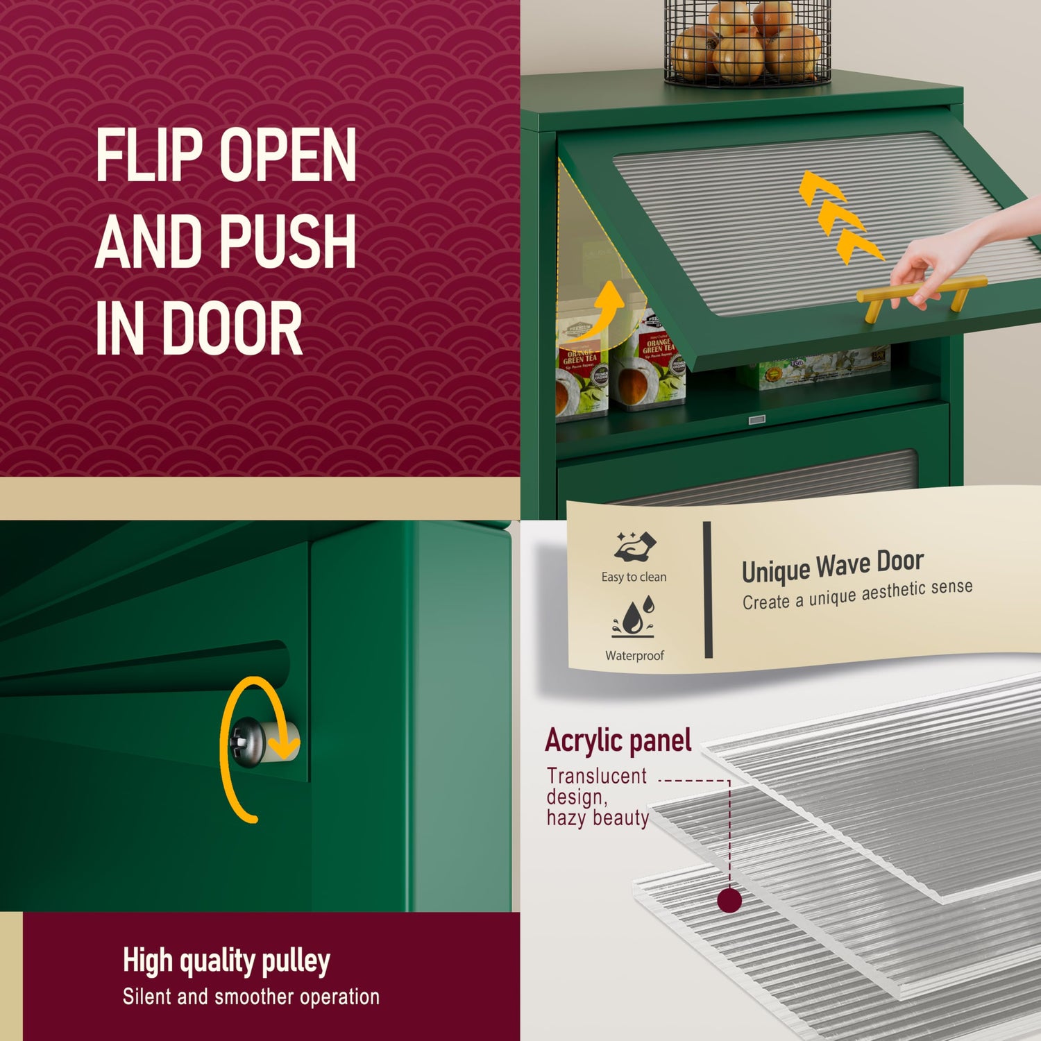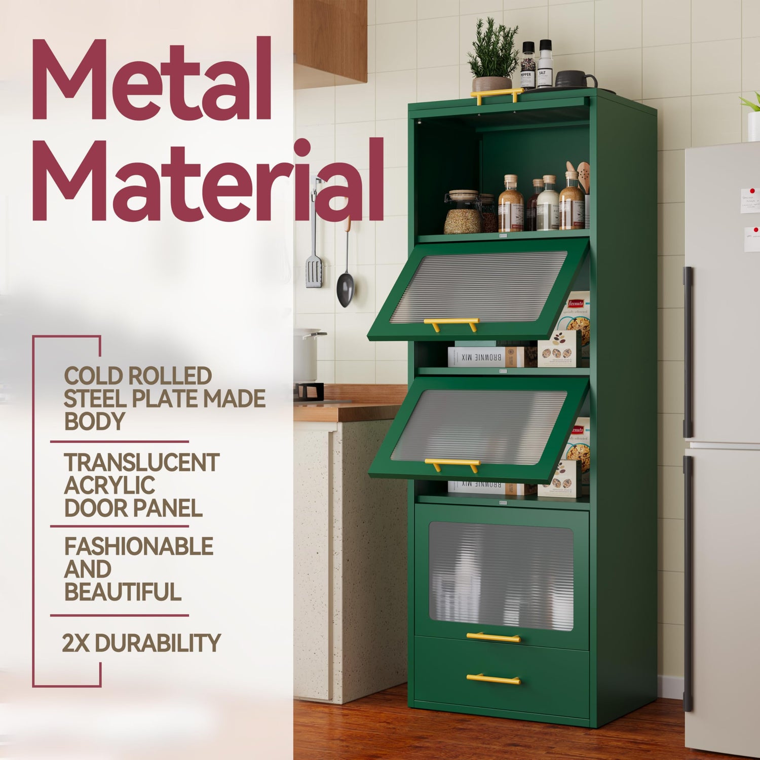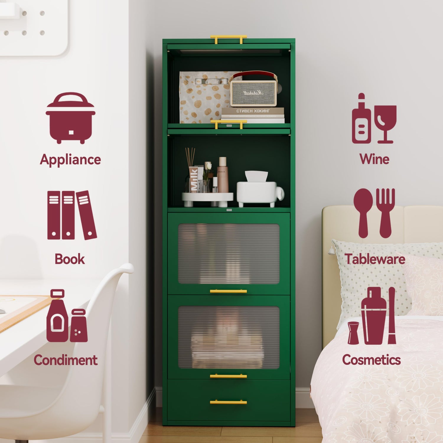 GAIOUS 5-Tier Kitchen Pantry Cabinet, Display Storage Cabinet with 4 Flip-up Acrylic Glass Doors and 1 Drawer, Green Freestanding Bakers Rack to Storage Small Microwave Spice Seasoning Bowl Cup Books