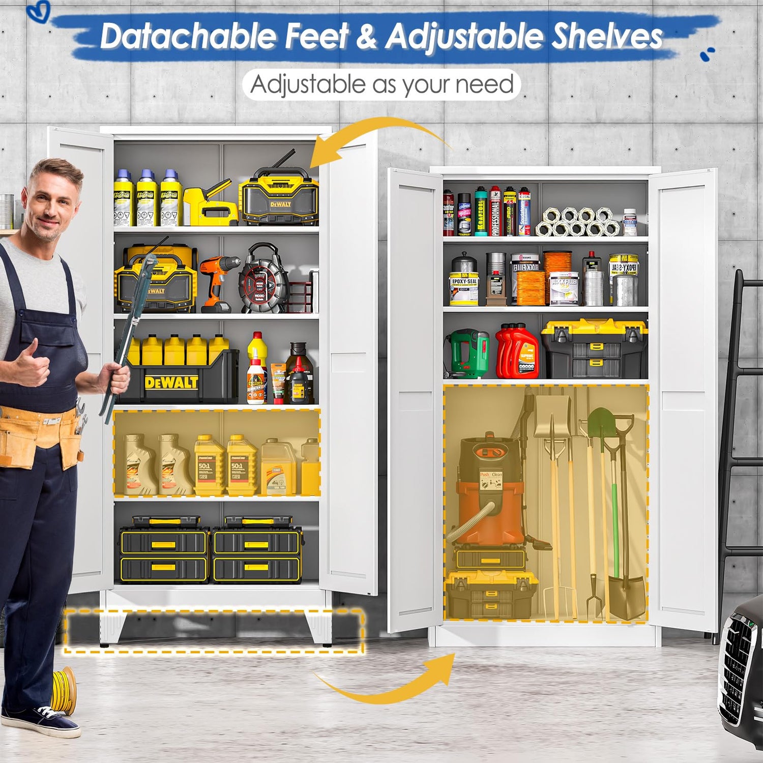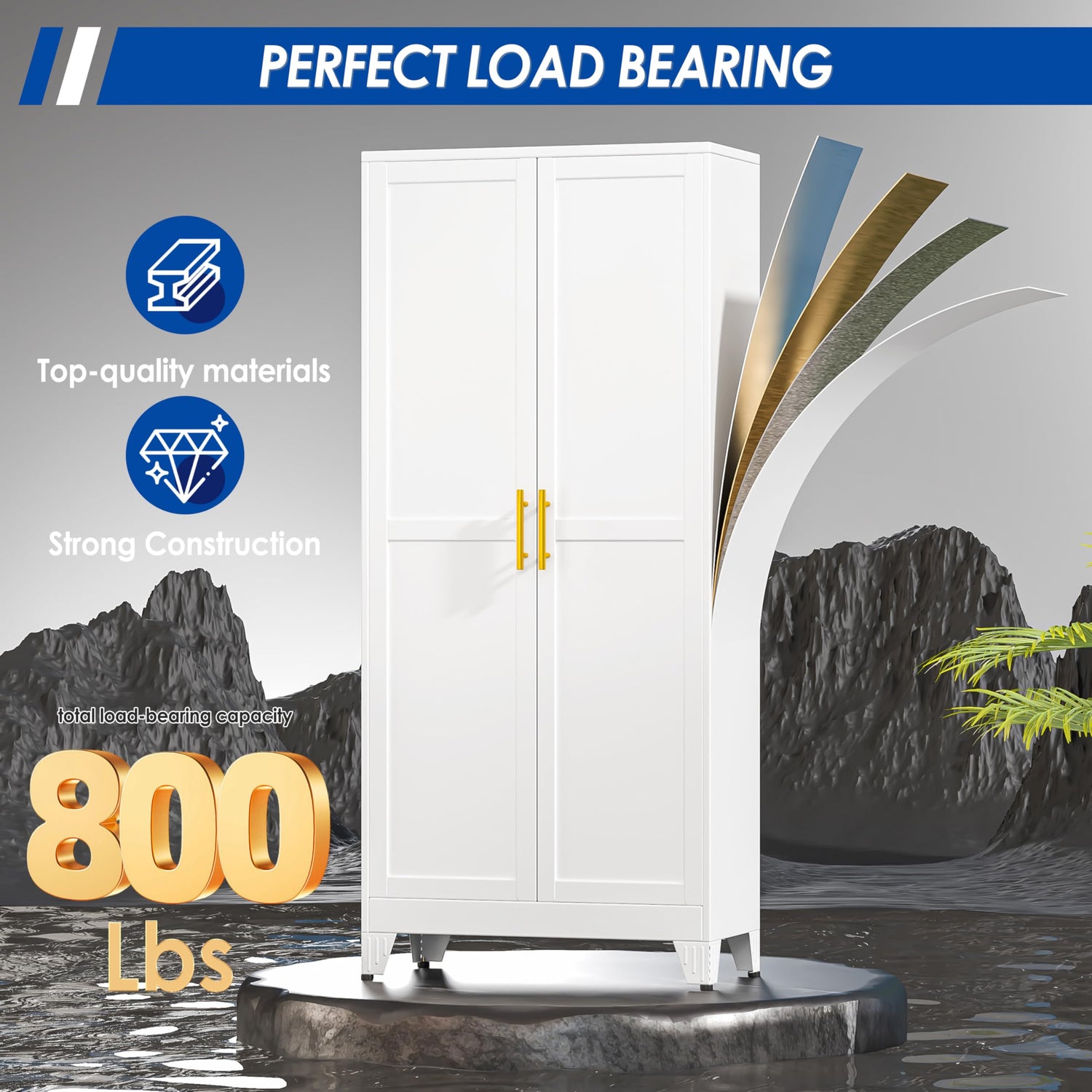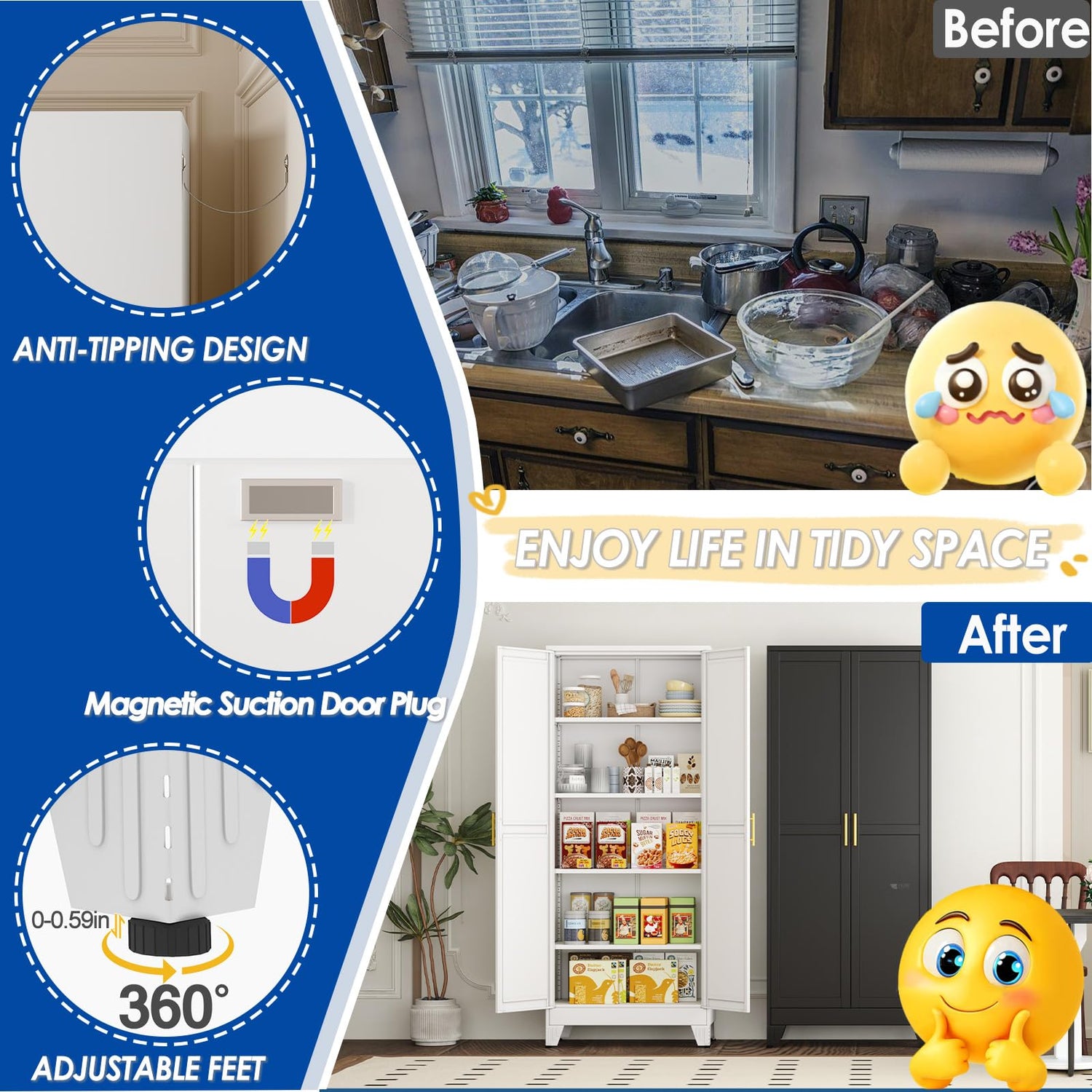 GAIOUS 71" Tall Metal Storage Cabinet with 2 Doors and 4 Adjustable Shelves, Kitchen Pantry Cabinet White Freestanding Cupboard, 5 Tier Multifunctional Steel Storage for Office, Kitchen, Dining Room