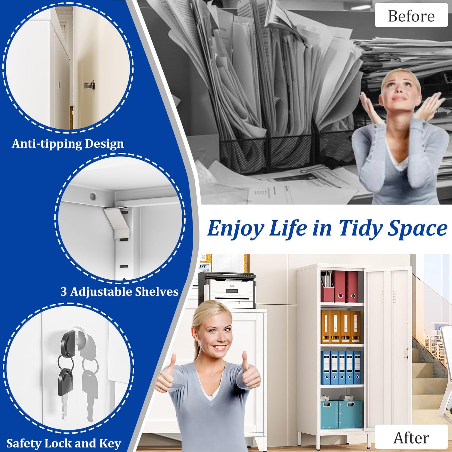 - 『♕Large Capacity Flexible Storage』The locked metal storage cabinet has 3 adjustable height shelves that can be disassembled or adjusted according to the items you store, greatly improving its applicability and flexibility. Large storage space, perfect for storing files, books, clothes, tools, bulky kitchenware, and other items. Maximize the utilization of limited storage space. It is an ideal choice for home and office organizers