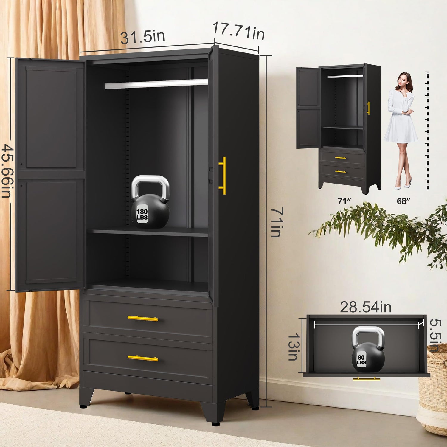 GAIOUS Steel Armoire Wardrobe Closet, 71" Metal Clothing Storage Cabinets with 2 Doors, 1 Adjustable Shelf and 2 Drawers, Metal Wardrobe Cabinet with Hanging Rod for Bedroom, Gym, Cloak Room (Black)