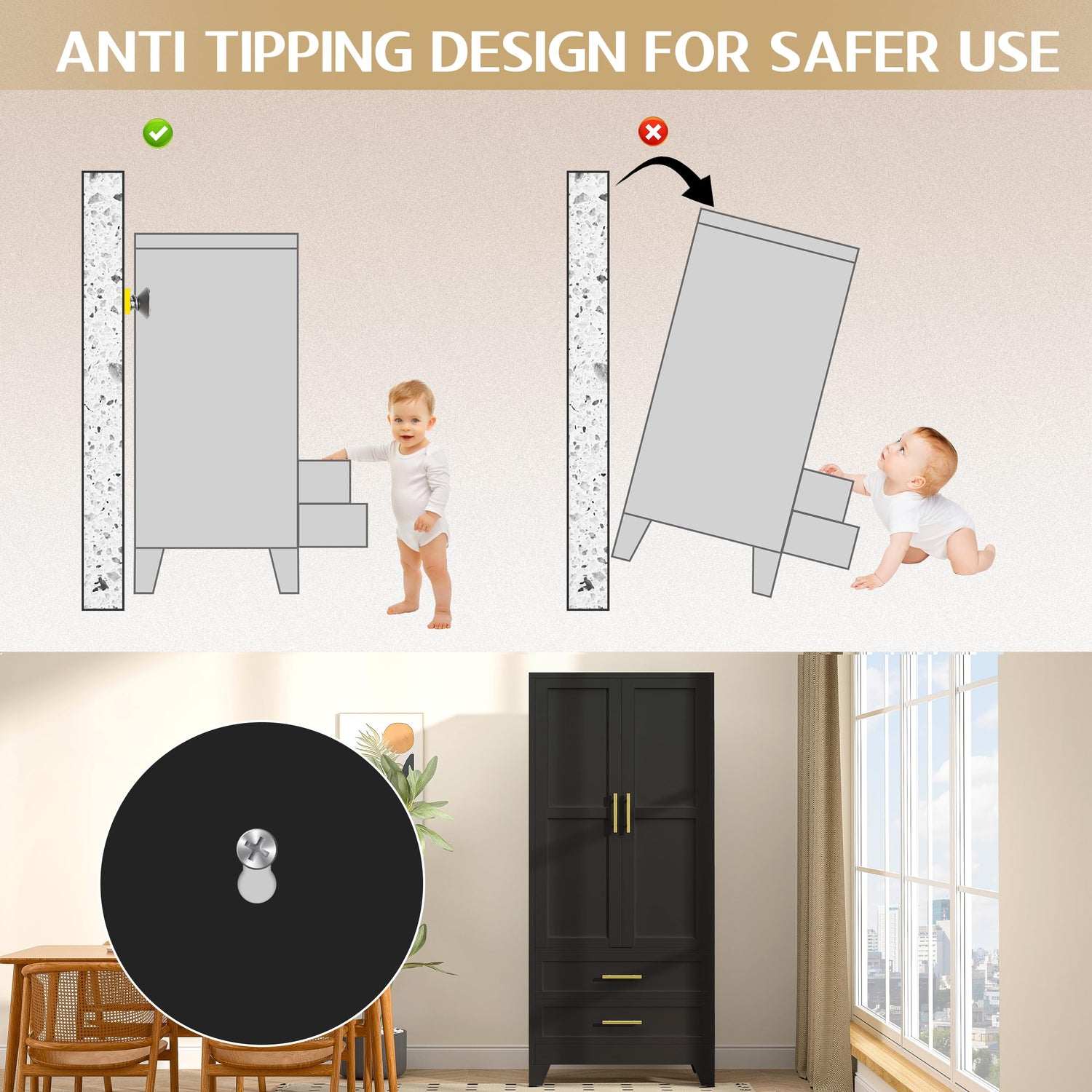 - 『♕Other Design』Each door of the metal locker storage cabinet has 2 strong magnets to ensure a tight closure. 4 adjustable height balancing feet can keep the cabinet stable even on uneven ground. The high wardrobe cabinet adopts an anti tipping design, with two reserved holes on the back for installing the standing wardrobe on the wall, preventing it from tilting forward due to heavy objects or strong dragging, protecting your and your family's safety