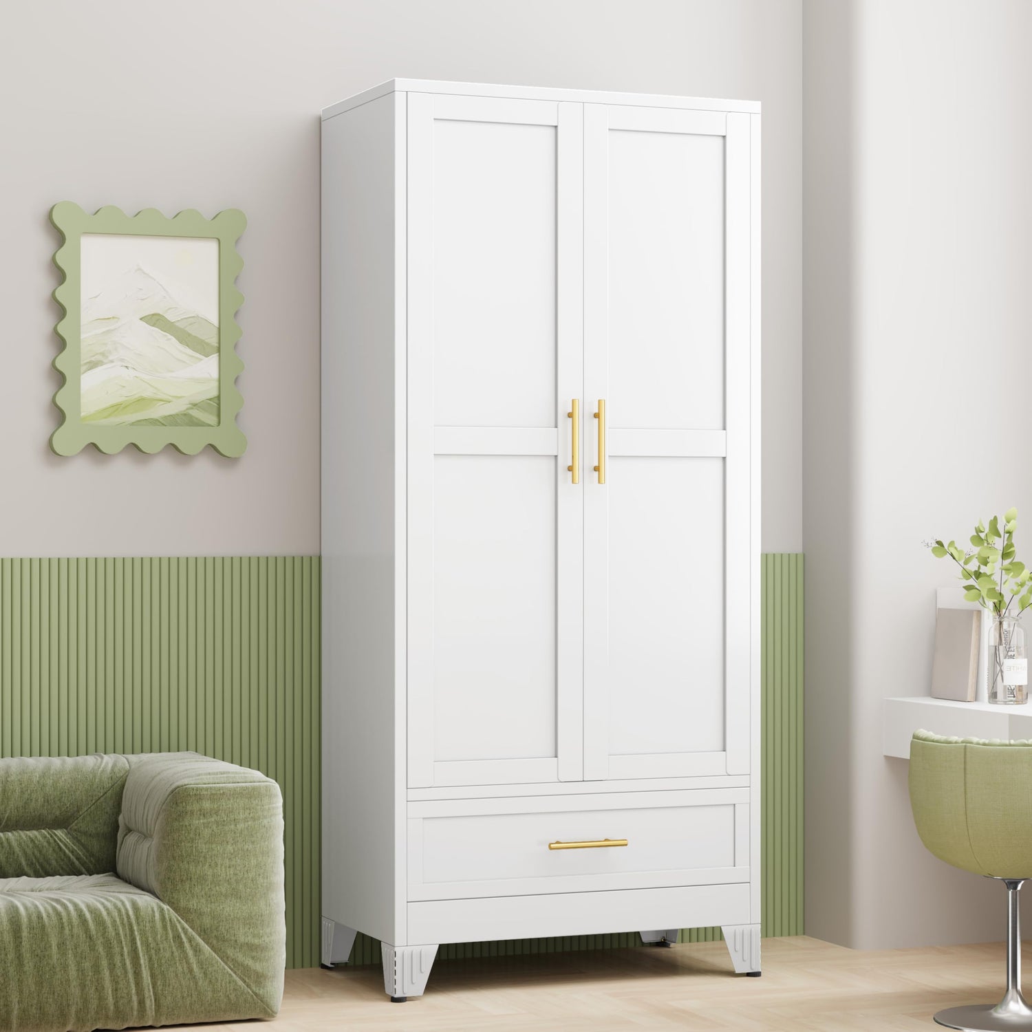 GAIOUS Steel Armoire Wardrobe Closet with 2 Doors, 71" Household Wardrobe Cabinet with Hanging Rod and Drawers, Metal Clothing Storage Cabinet with Adjustable Shelf for Bedroom, Cloak Room, Gym(White)