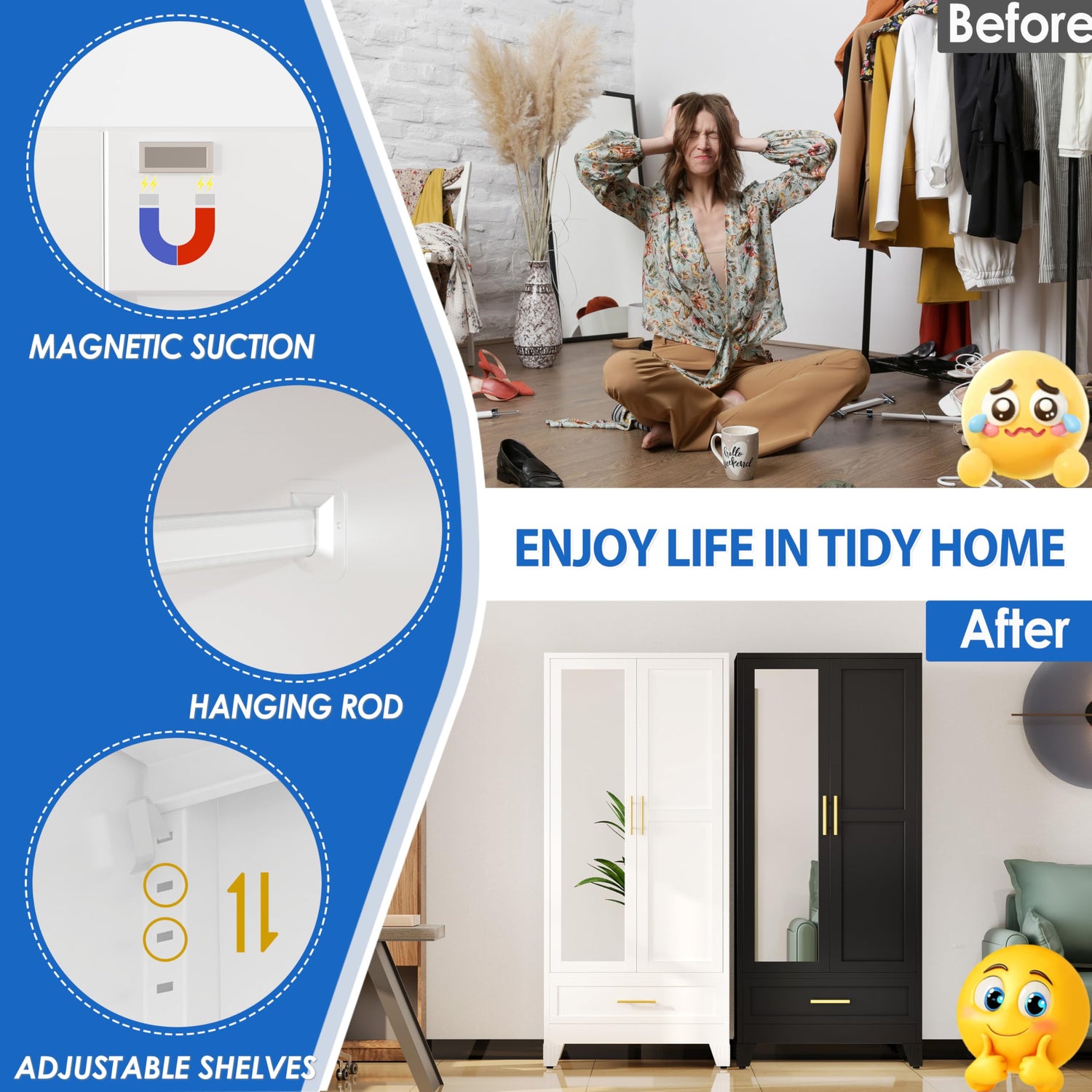 - 『♕Other Design』Each door of the metal locker storage cabinet has 2 strong magnets to ensure a tight closure. 4 adjustable height balancing feet can keep the cabinet stable even on uneven ground. The high wardrobe cabinet adopts an anti tipping design, with two reserved holes on the back for installing the standing cabinet on the wall, preventing it from tilting forward due to heavy objects or strong dragging, protecting your and your family's safety