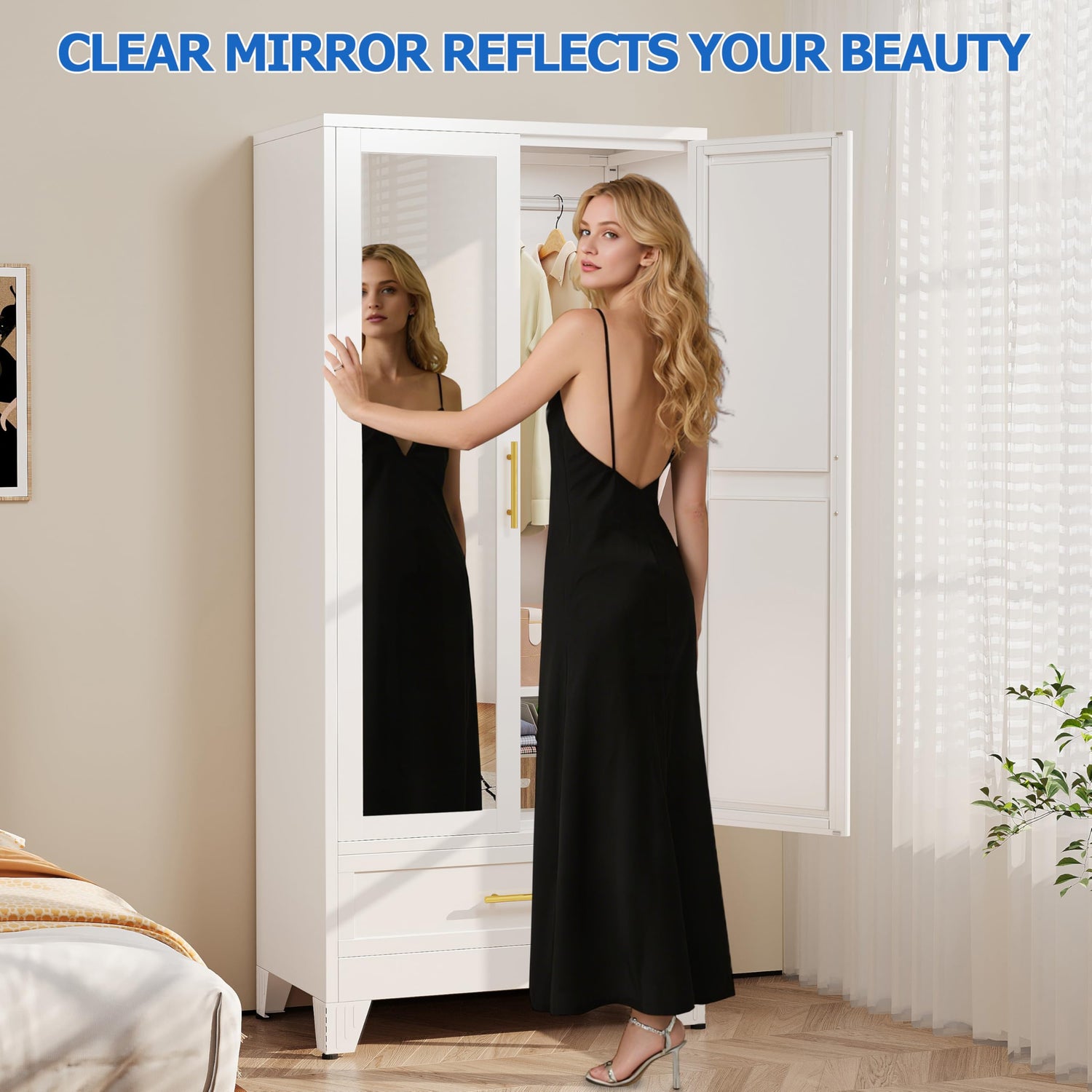 GAIOUS Steel Armoire Wardrobe Closet with Mirror Doors, 71" Household Wardrobe Cabinet with Hanging Rod and Drawer, Metal Clothing Storage Cabinet with Adjustable Shelf for Bedroom, Cloak, Gym(White)