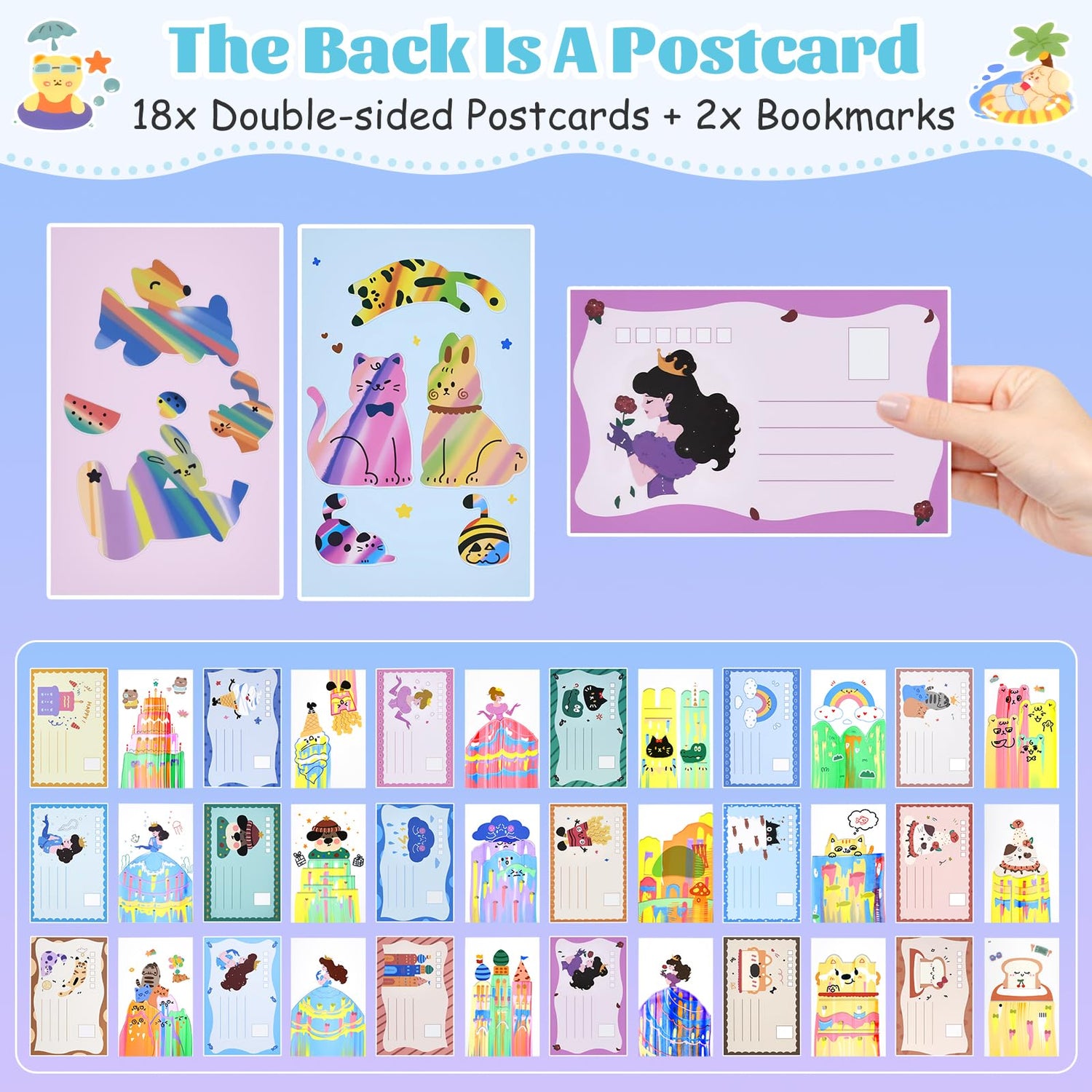 - 【DIY Postcards Design】The reverse side of the rainbow scratch paper features postcard templates, perfect for kids to design personalized birthday greetings, festive holiday wishes, artistic photographs, or thoughtful gift cards for family and friends. Encorage children to create and share the magic of rainbows!