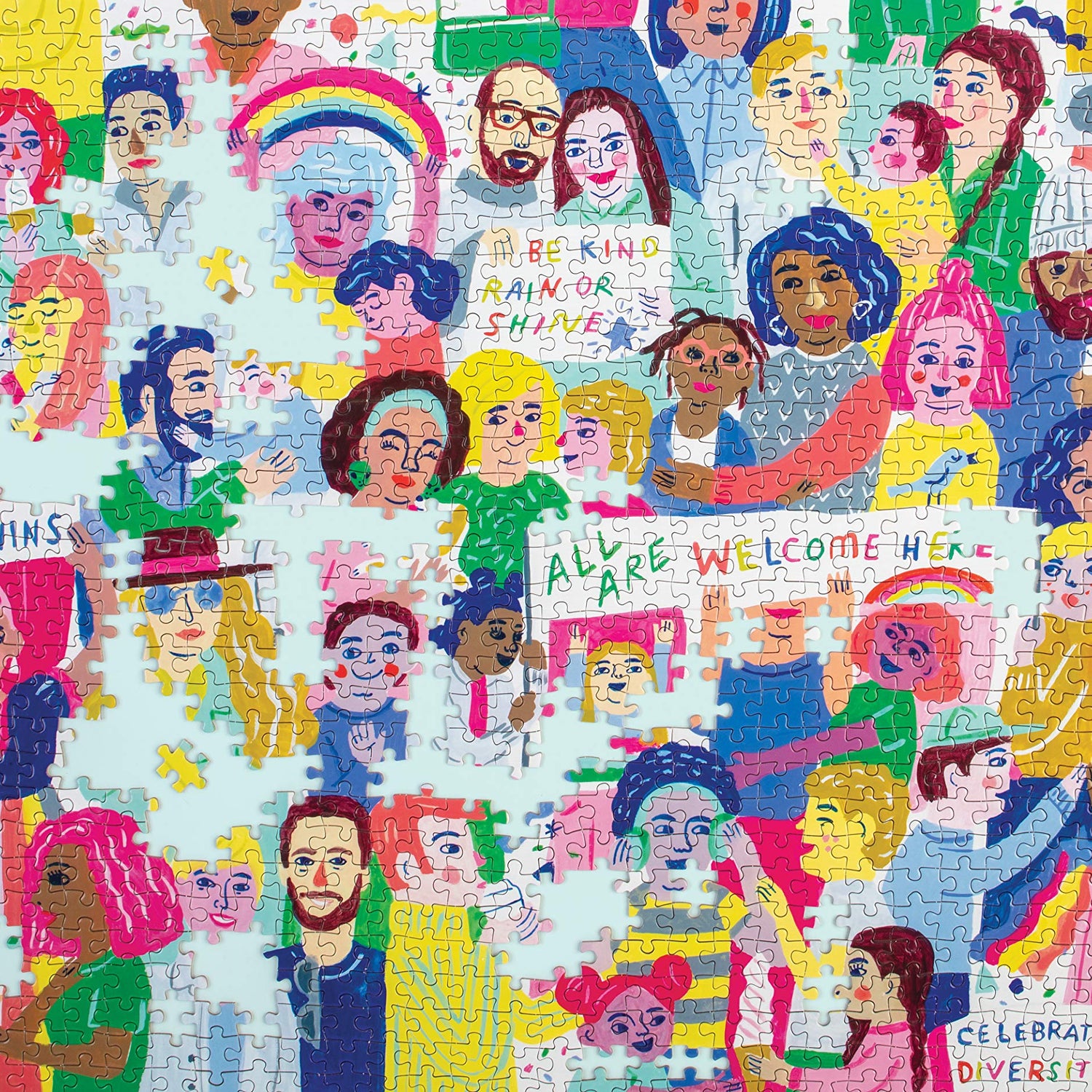 - CELEBRATE DIVERSITY: All Are Welcome Here jigsaw puzzle showcases human diversity and acts of kindness. The inspiring illustration includes positive mantras for living and inclusion such as “be kind rain or shine, ” “love wins” and more.