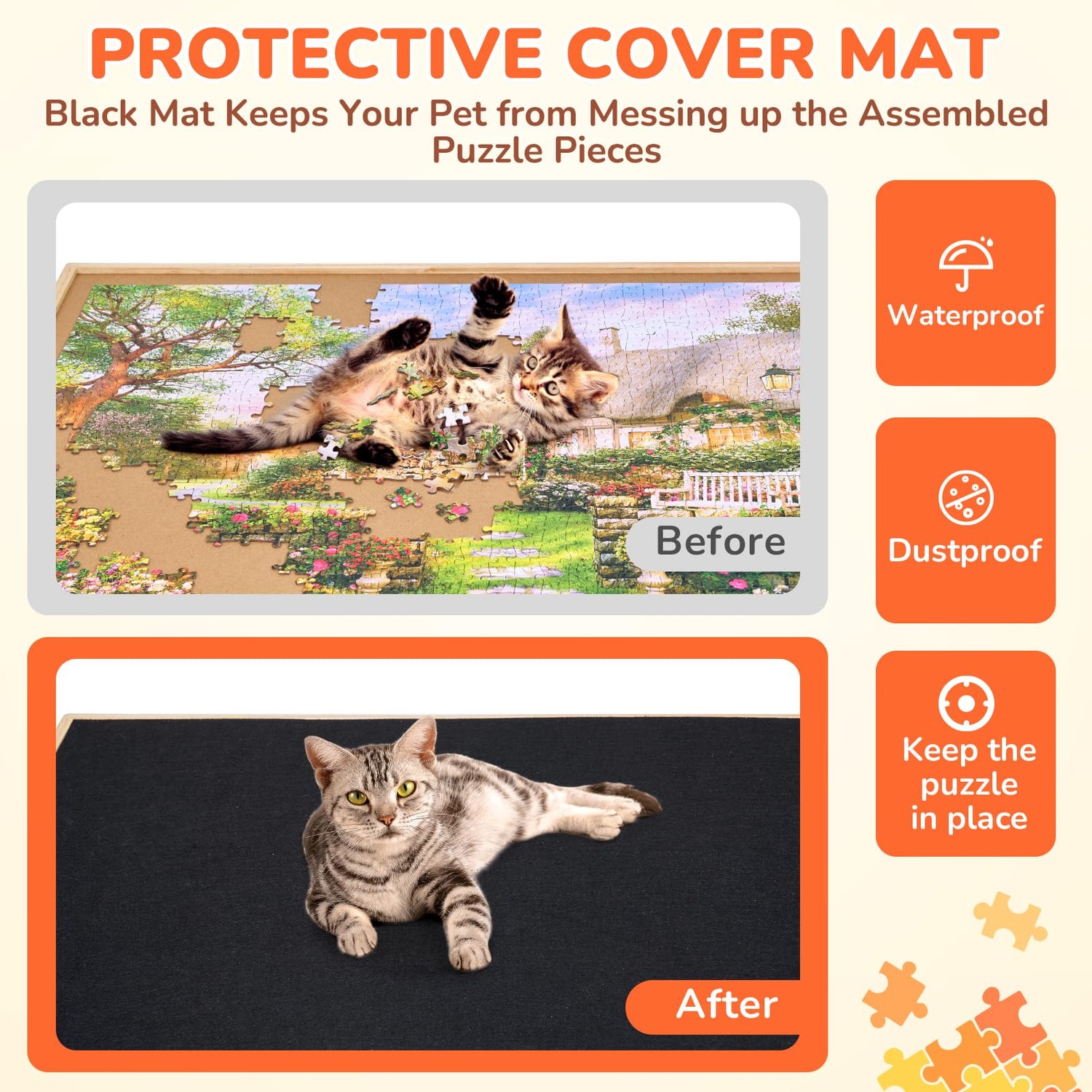 - Thoughtful Accessory of Cover Mat: This well-made puzzle board comes with a heavy black cover mat, preventing pets or unwanted hands from messing puzzles up and meanwhile helping to keep the finished puzzles in place even when bumped.
