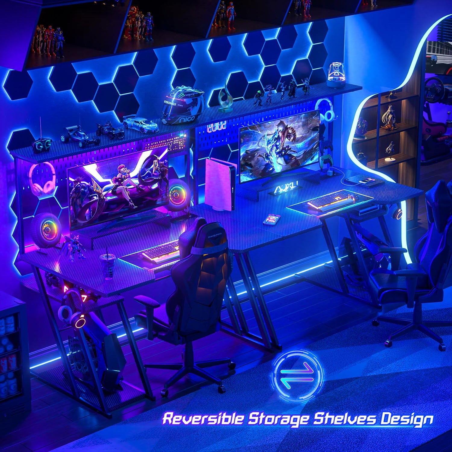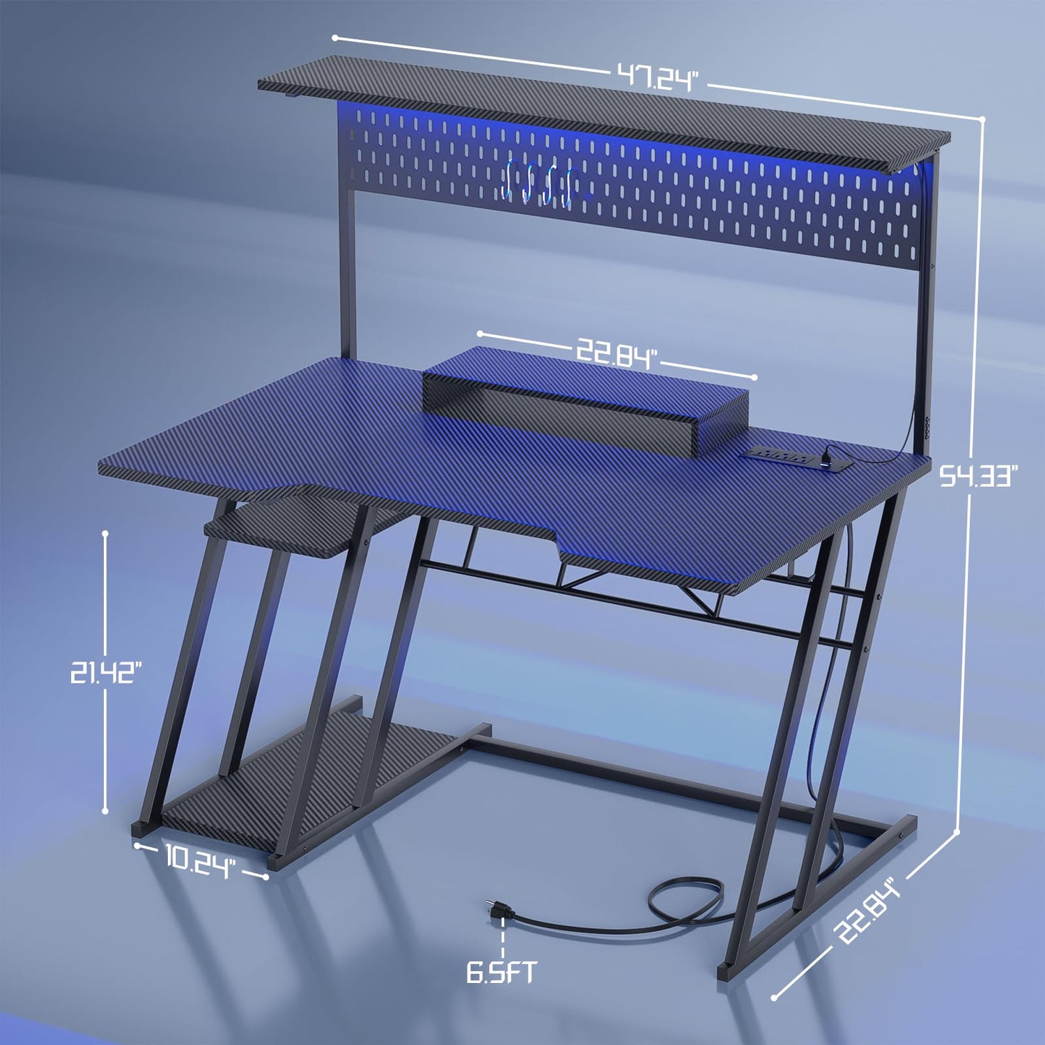 Gaming Computer Desk with Power Outlets, Gaming Desk with Hutch and LED Lights, Reversible PC Gaming Desk with Pegboard, Carbon Fiber Black, 47"